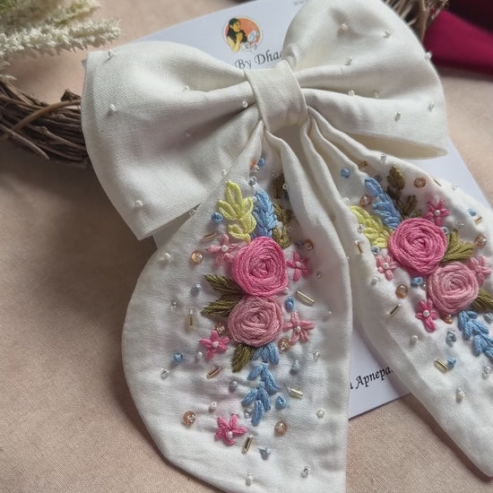 Gazel White Hand Embroidered Bow Hair Clip with Floral Detailing
