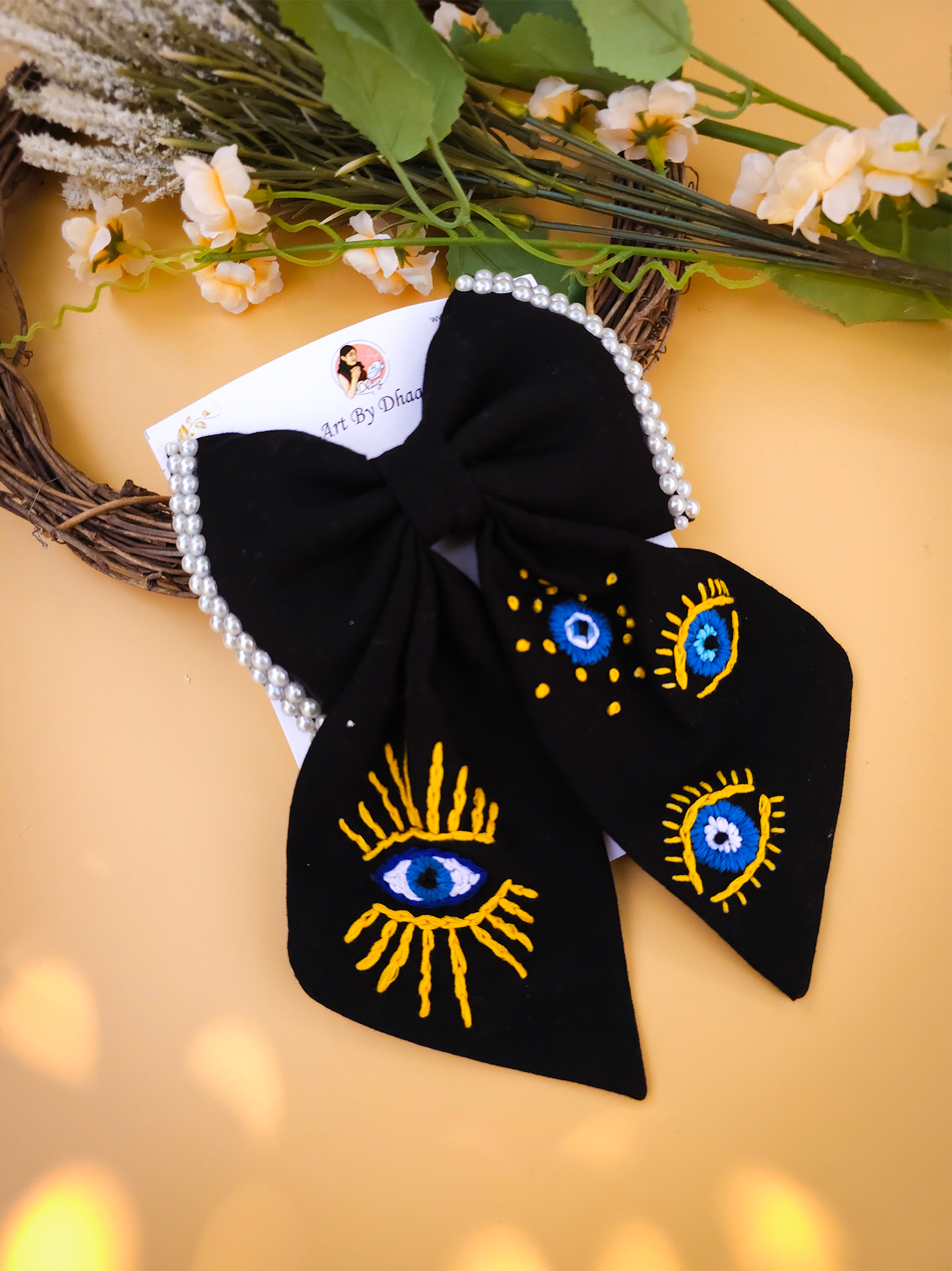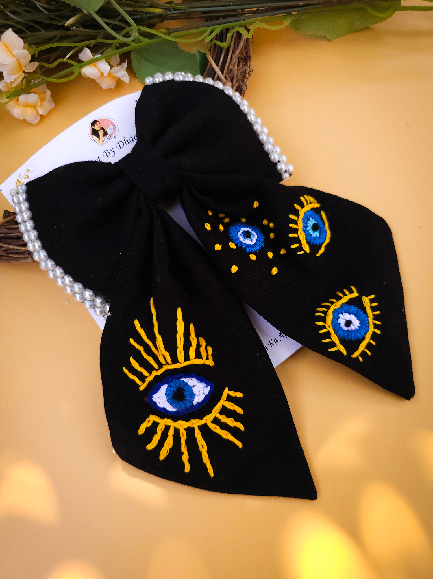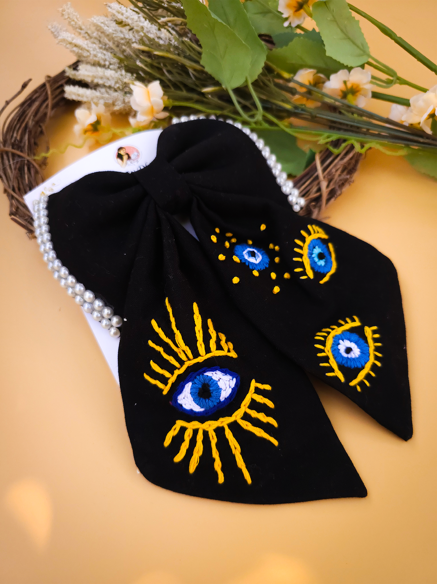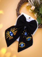 Nazarana Bow is a beautifully handcrafted black bow featuring a delicate evil-eye embroidery — designed to add style while carrying the timeless charm of nazar protection.