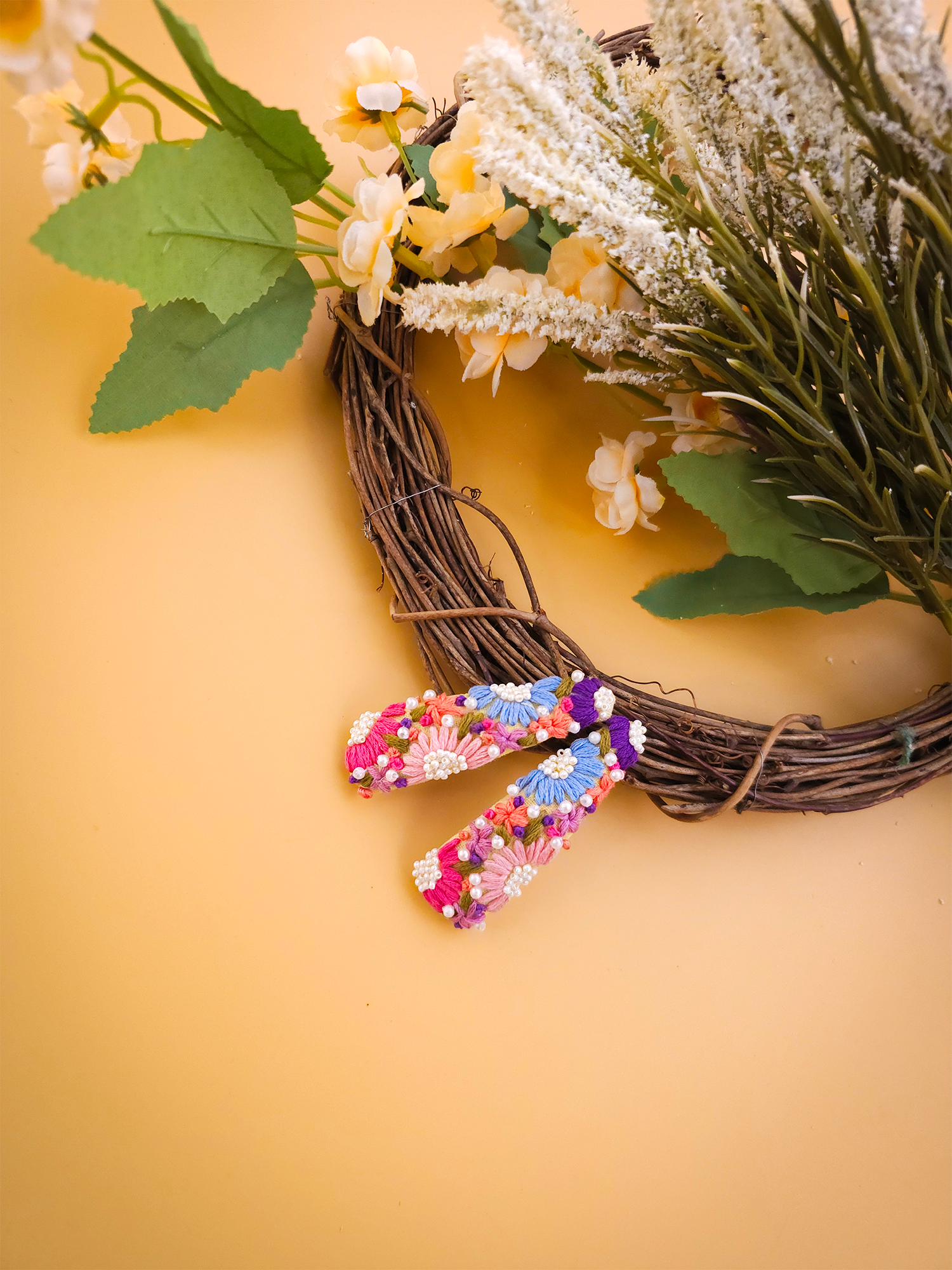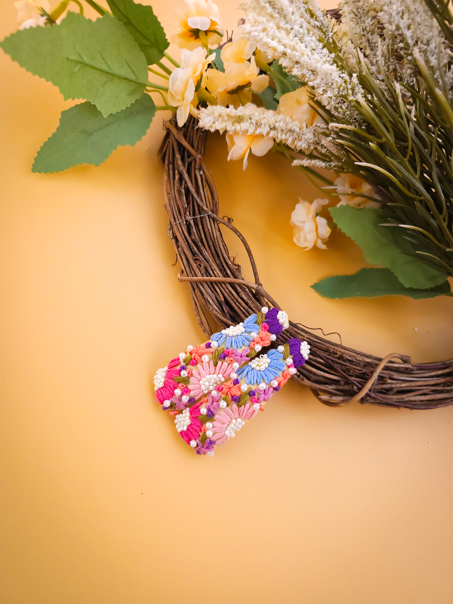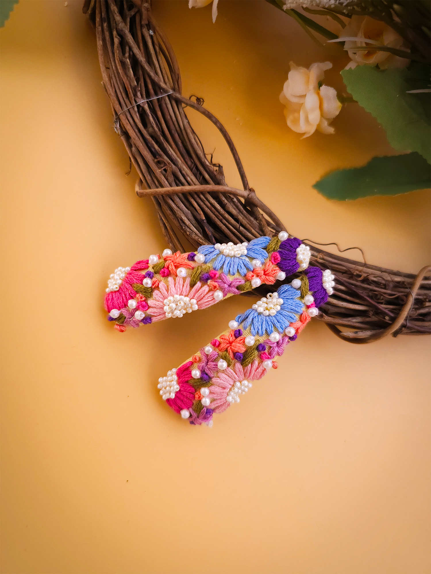 This tic tac set features hand-embroidered colourful florals paired with elegant pearl accents, creating a look that feels both playful and premium.