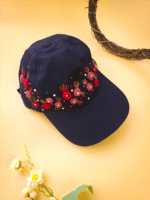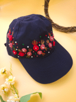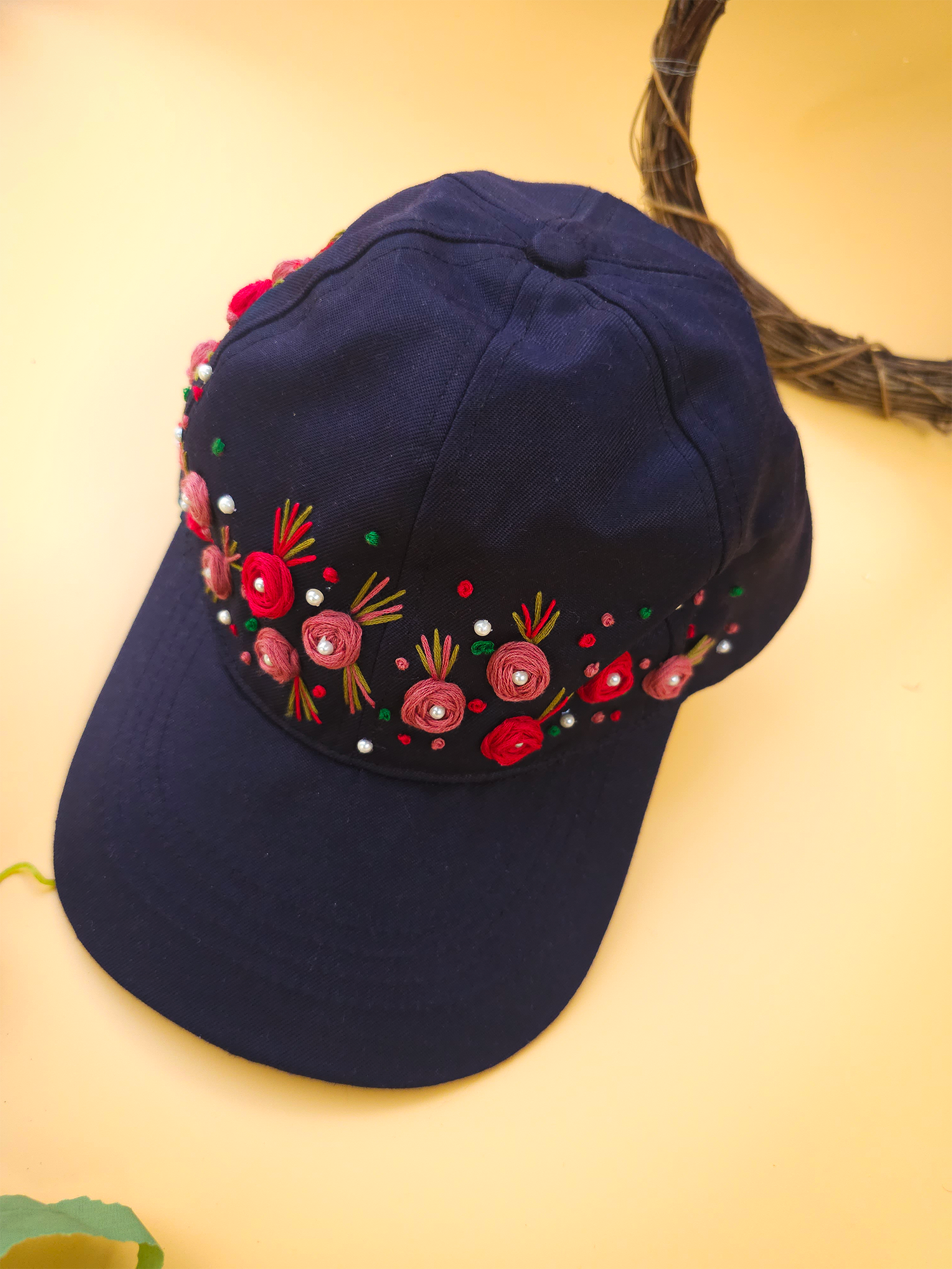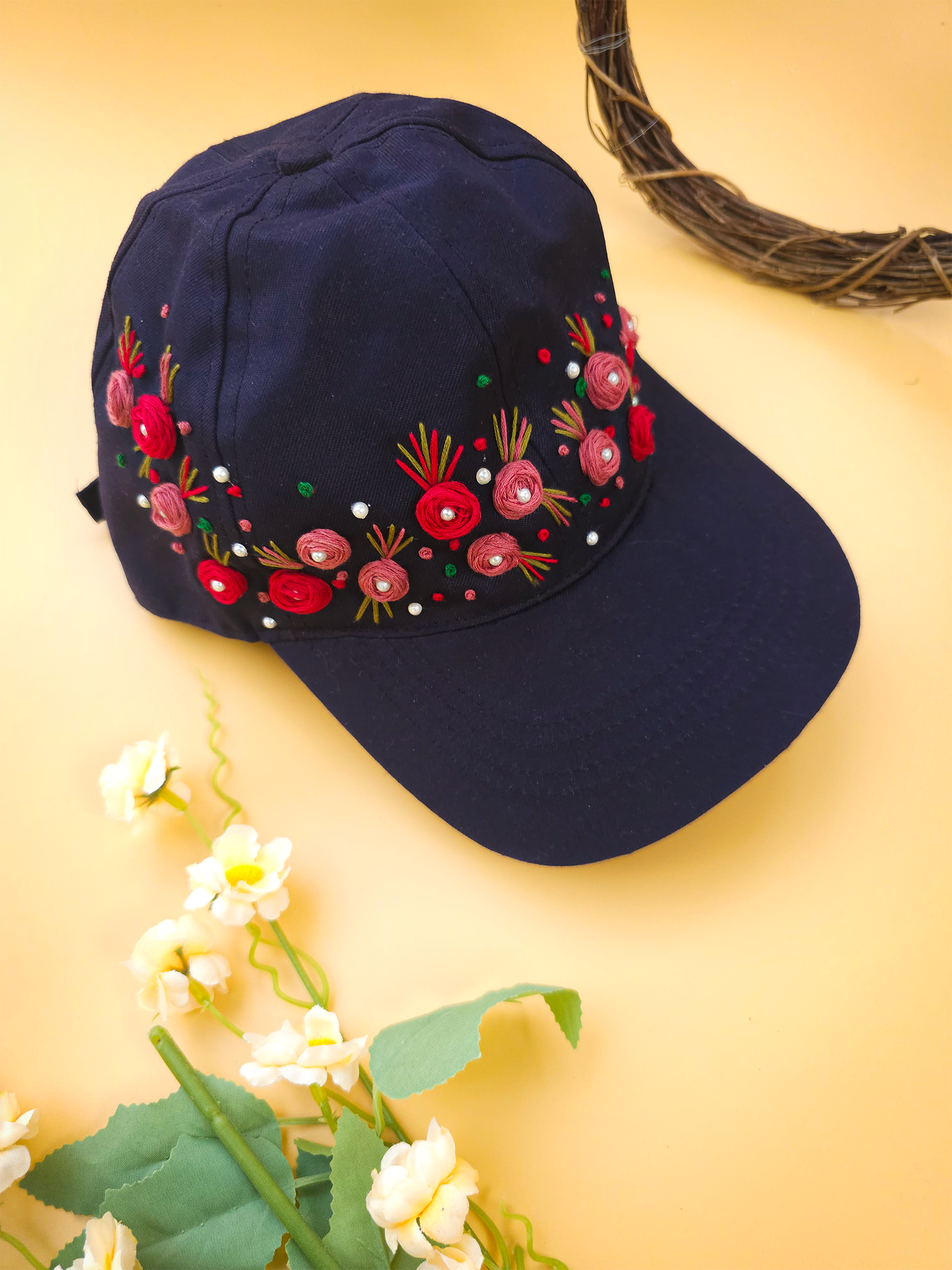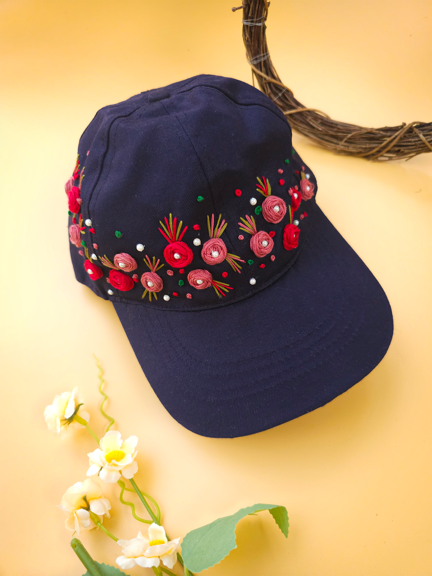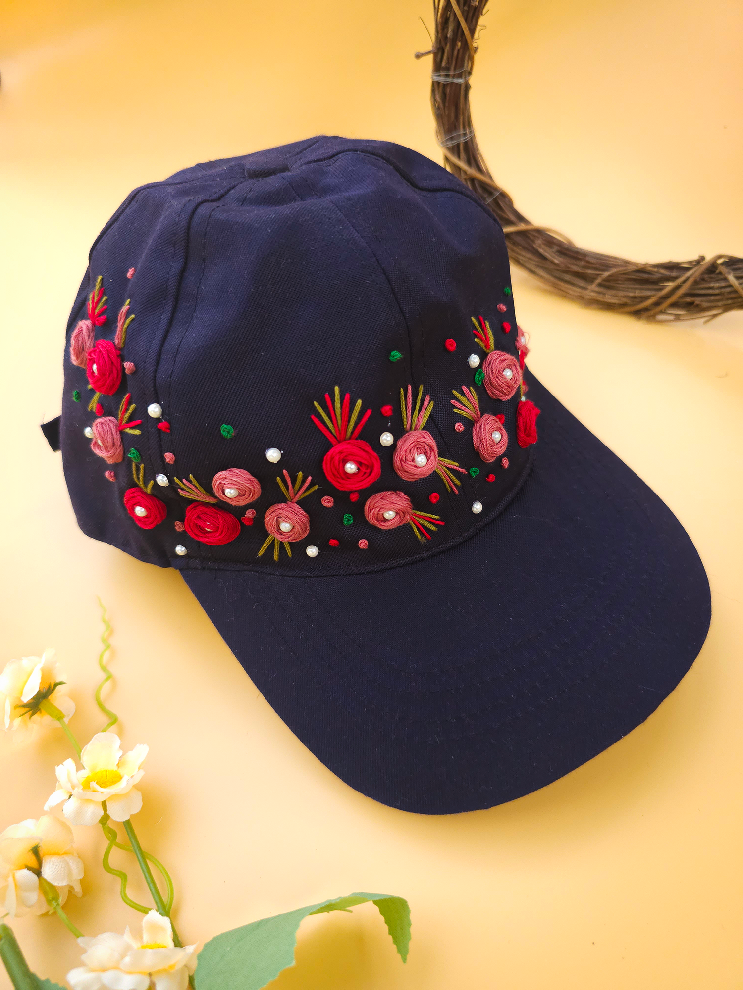 Crafted on a soft blue base, it features hand-embroidered red and pink florals that pop beautifully, giving the cap a bright and elegant finish.