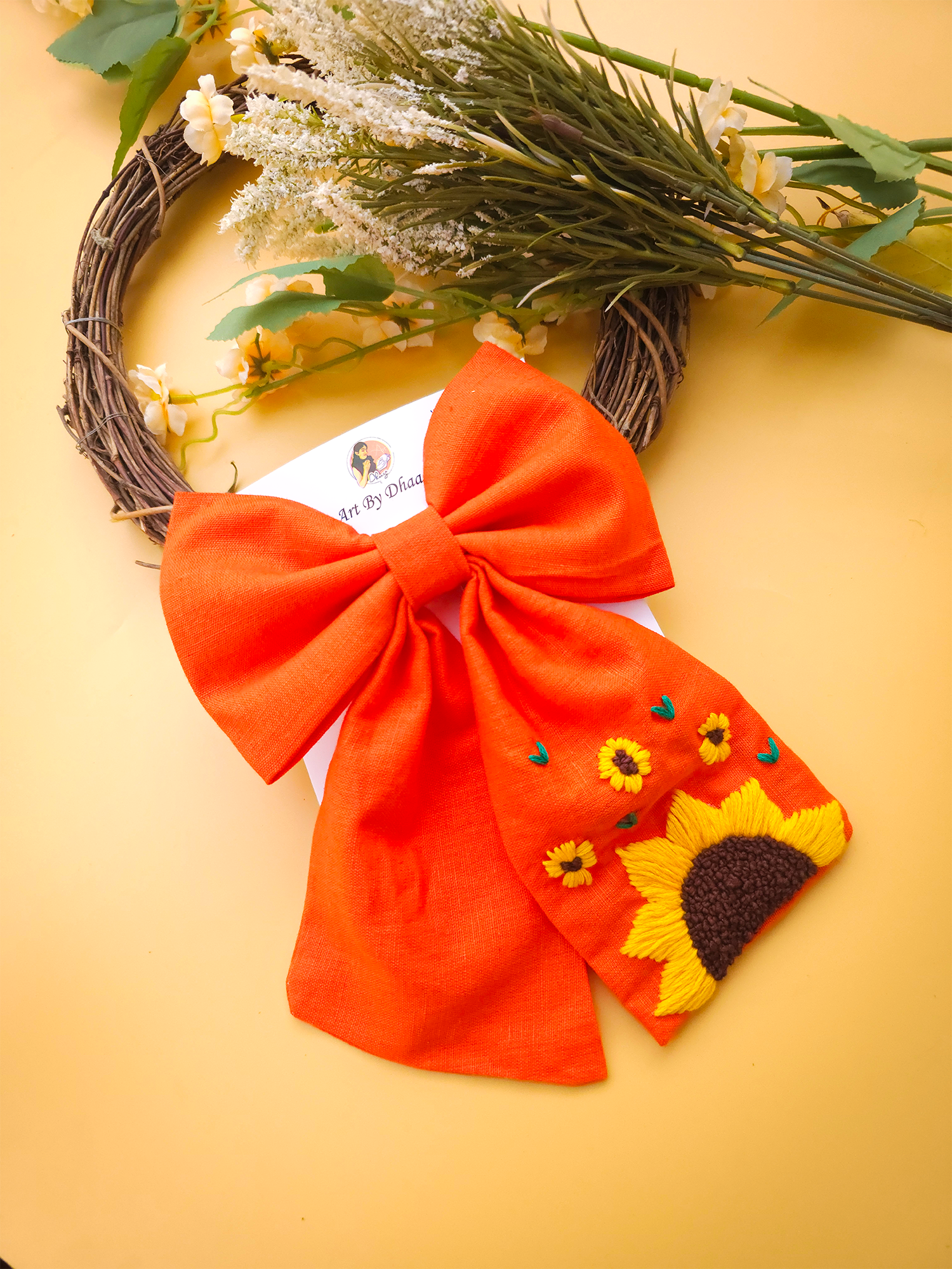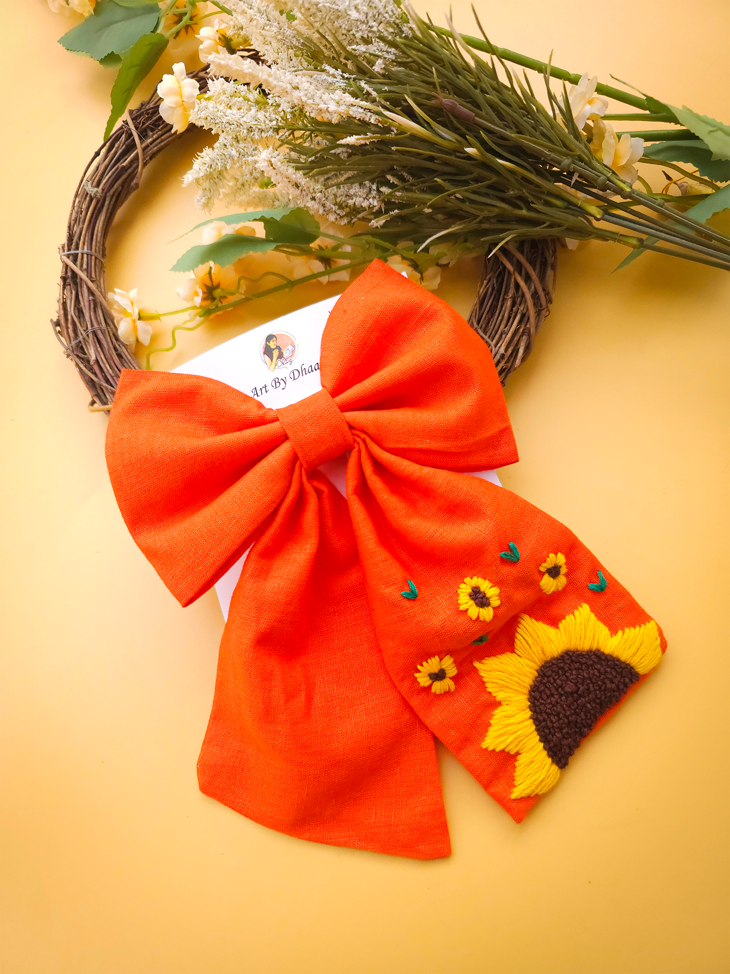 Be My Sunflower is a vibrant orange handcrafted bow featuring a beautifully embroidered big sunflower that instantly brings warmth and happiness to any look. It’s the perfect accessory for girls who love cheerful colours and nature-inspired charm.