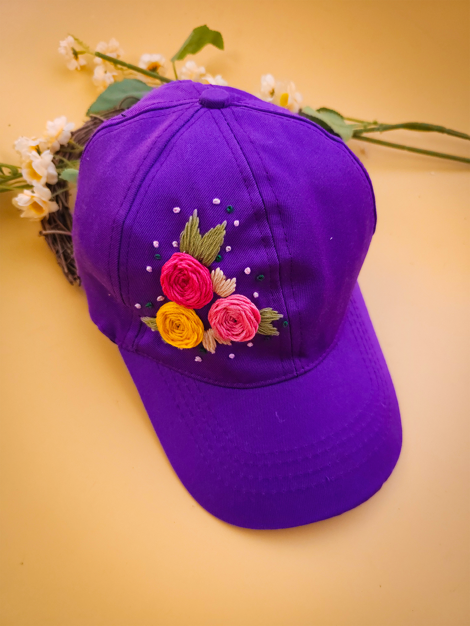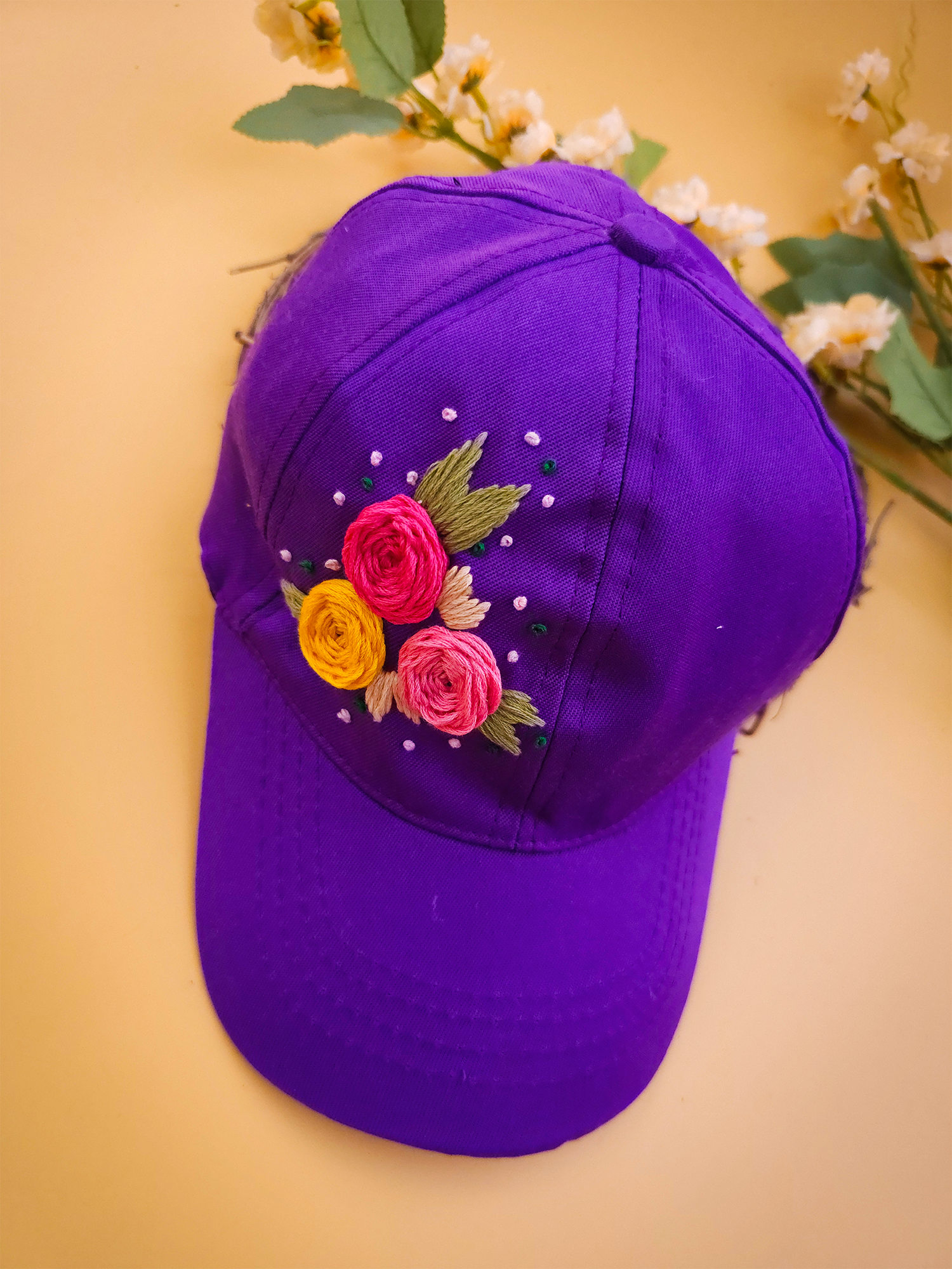 Made in a soft purple shade, this cap features delicate three-colour floral embroidery with tiny dotted details that give it a neat, premium finish.
