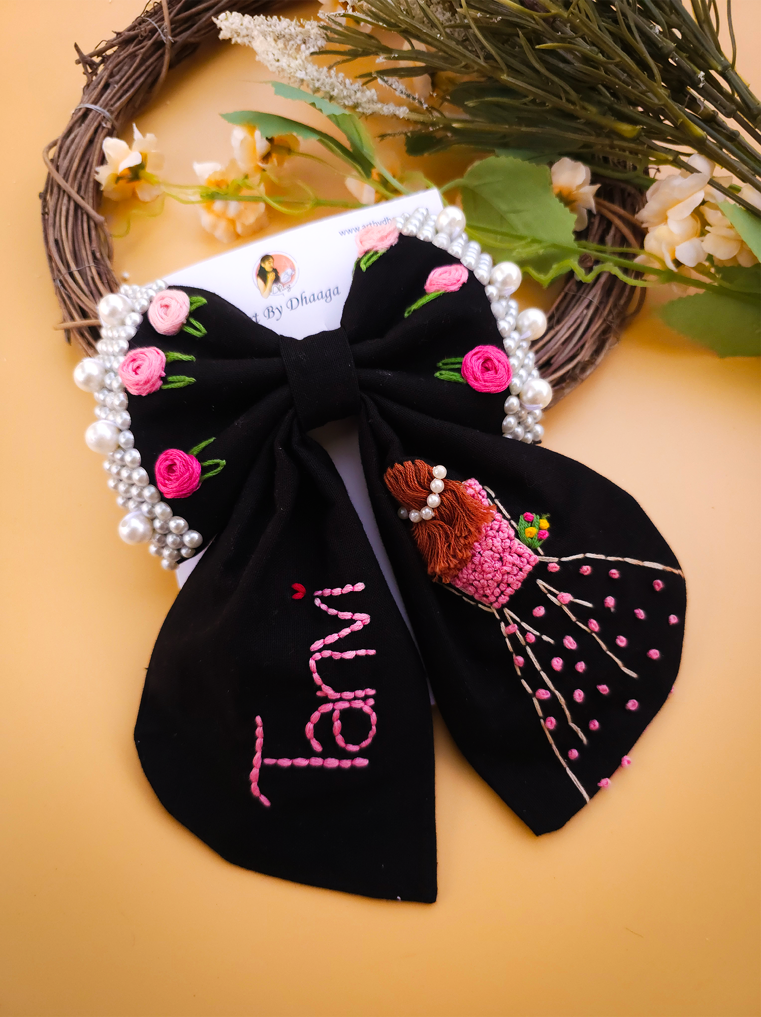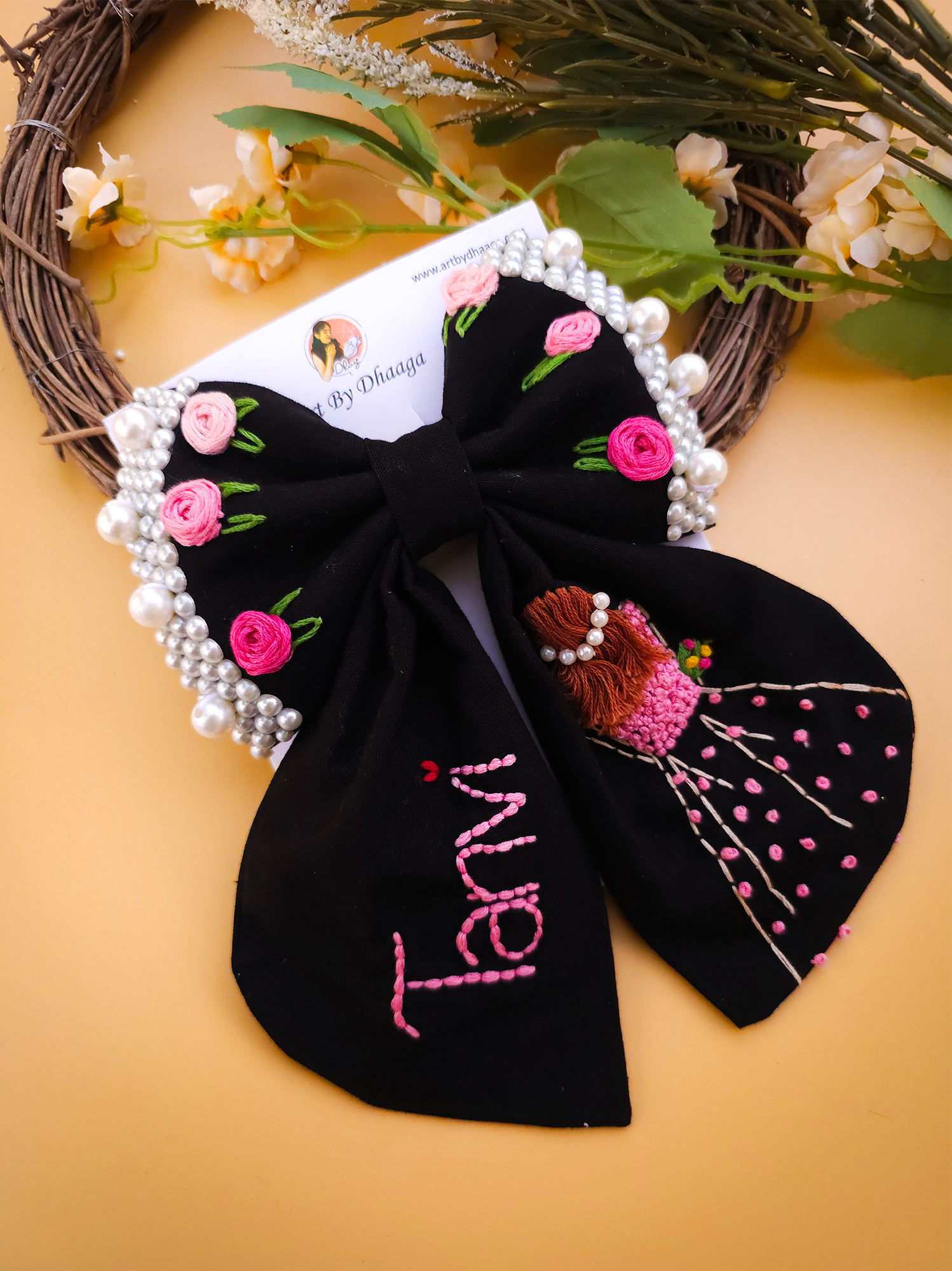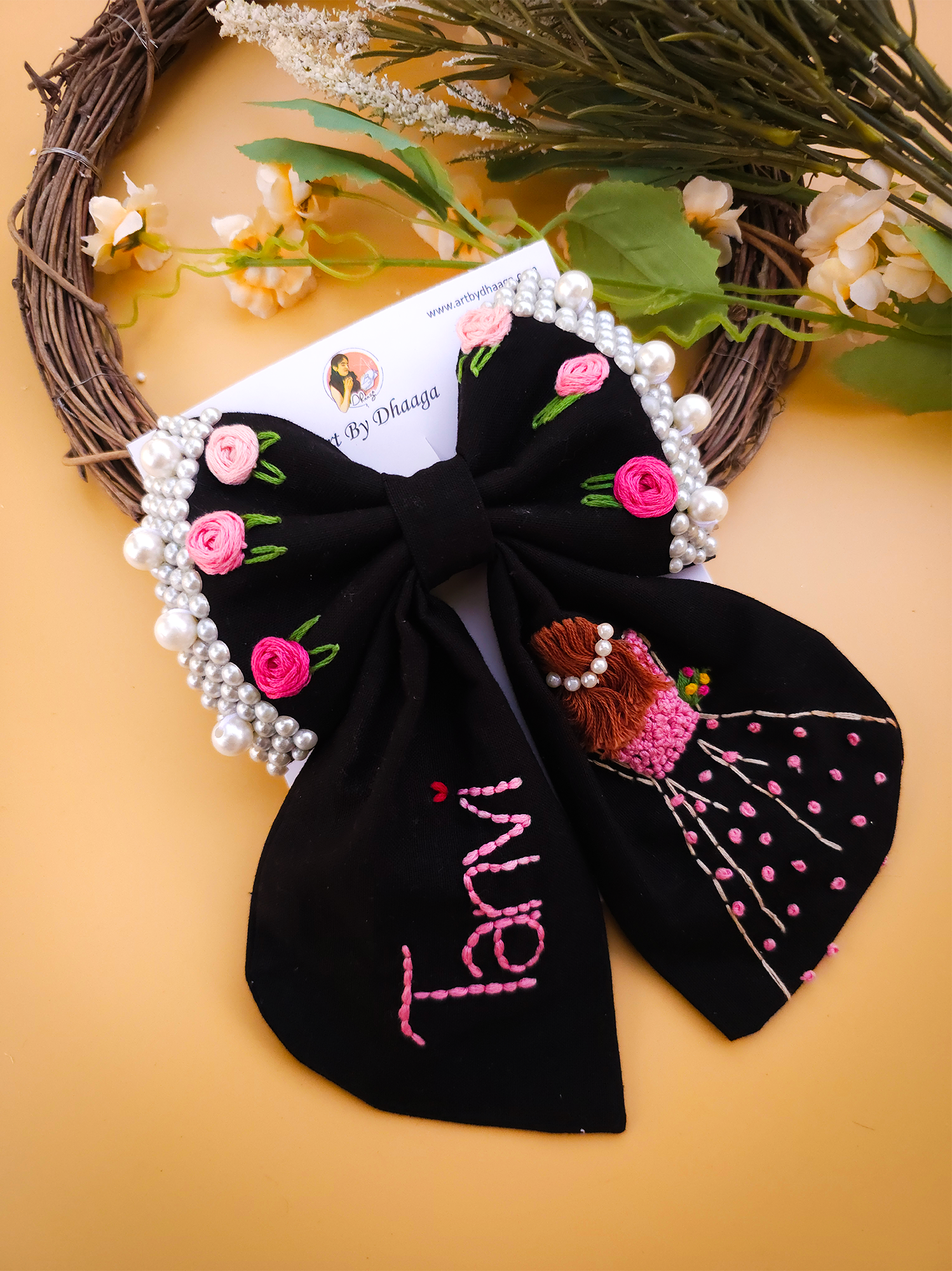 Crafted with vibrant, long-lasting embroidery threads and secured on a sturdy clip, every bow is a unique piece of art – designed to last and impress.