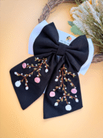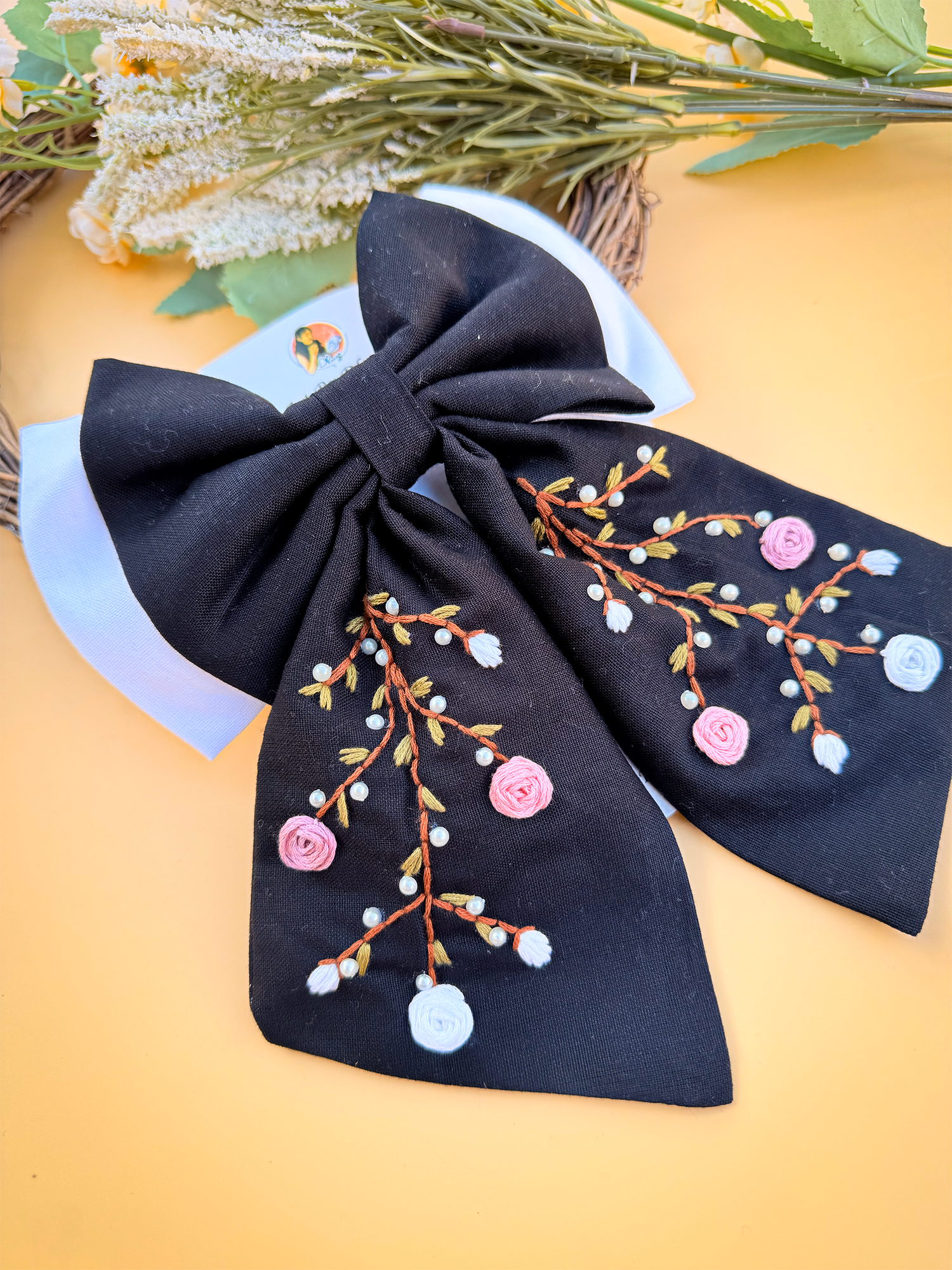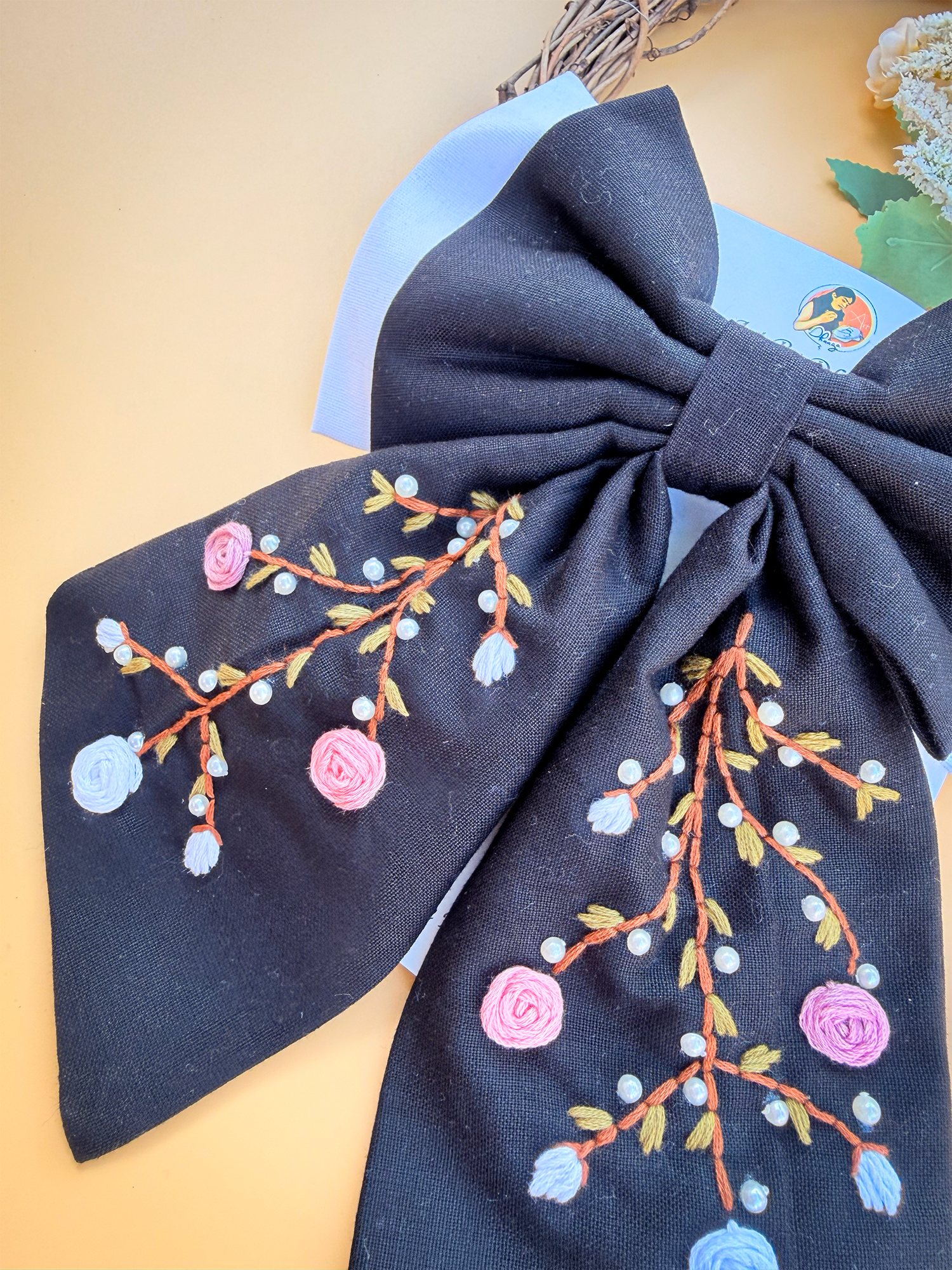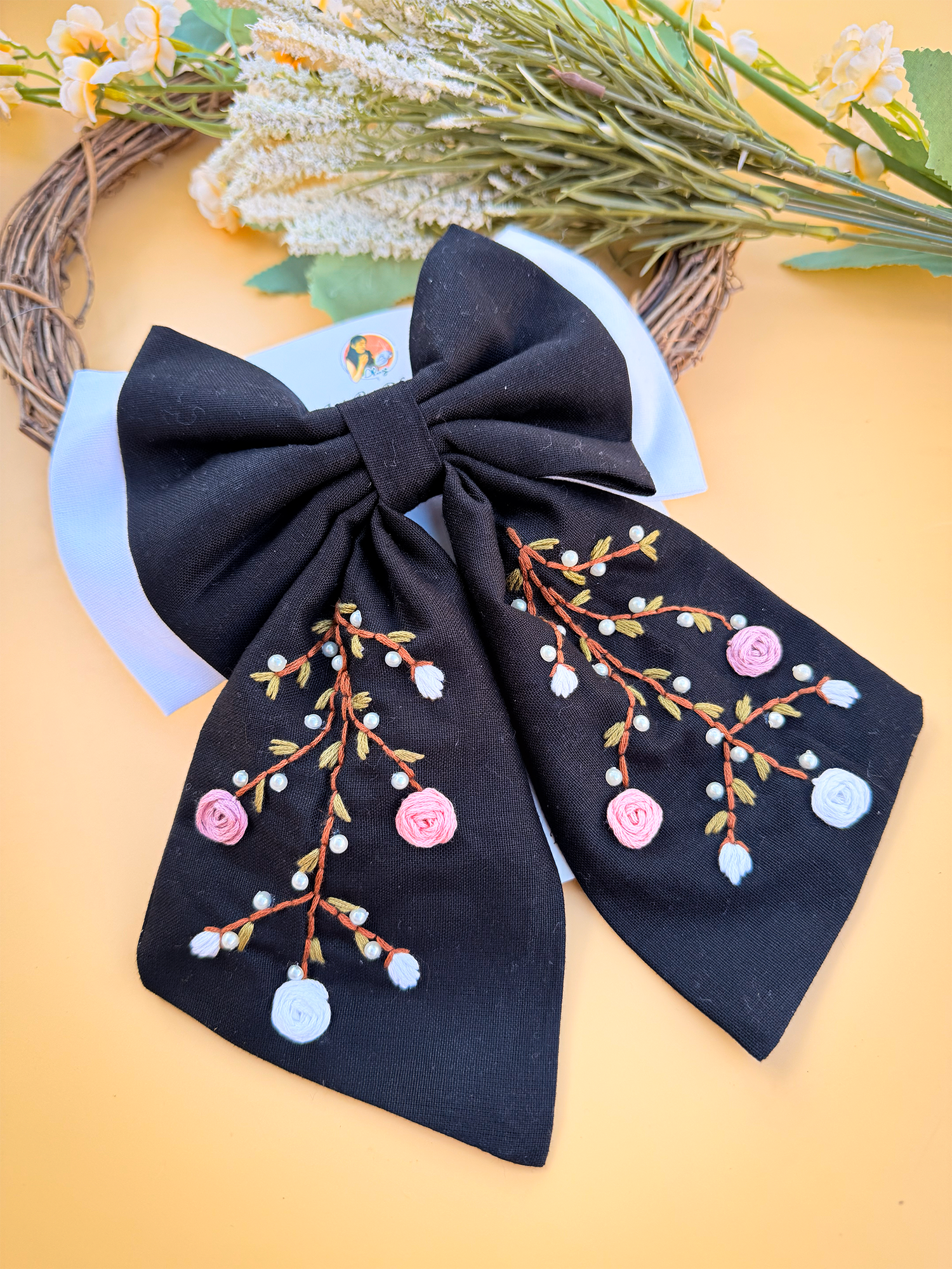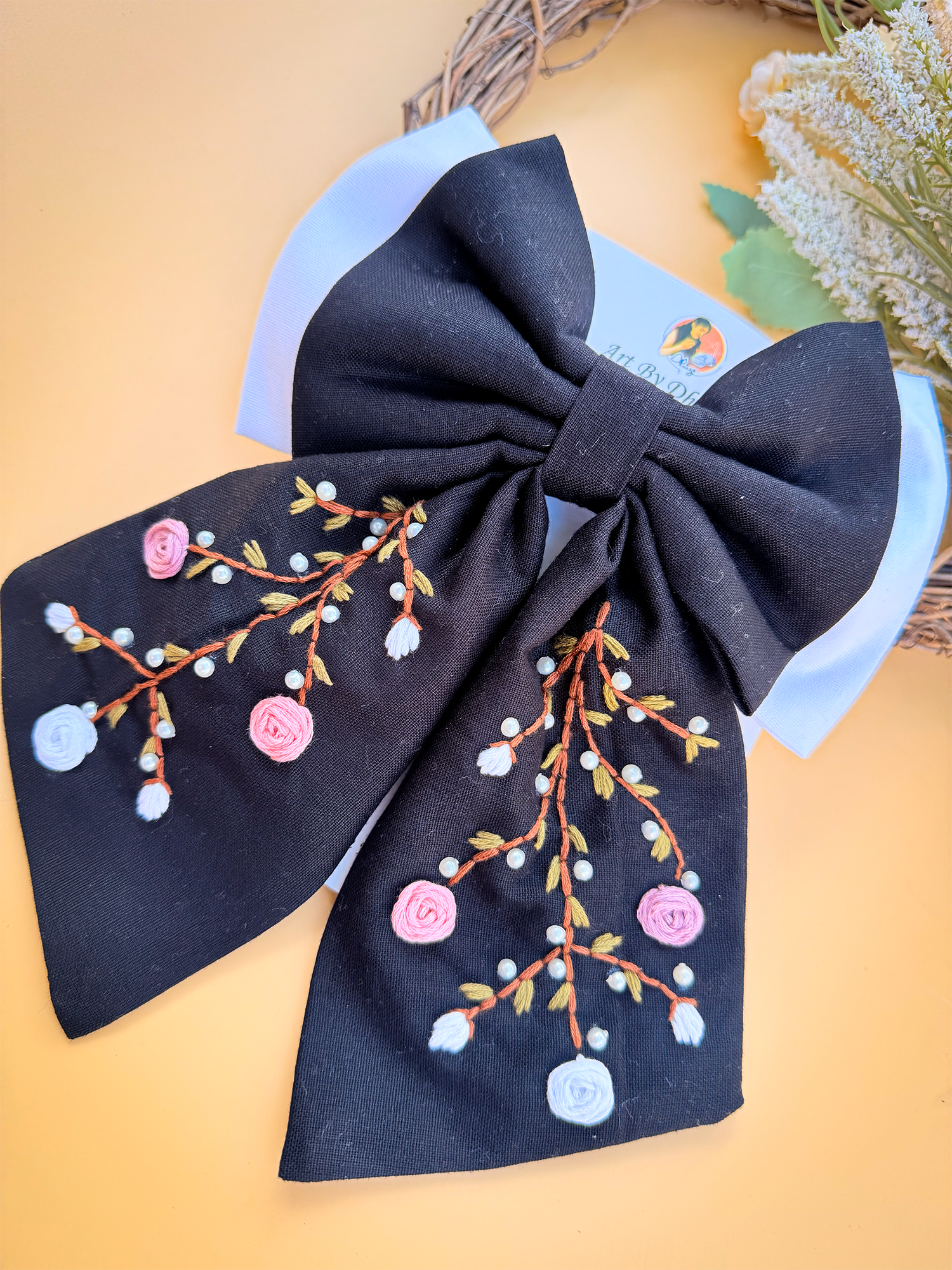 Aaradhya-Black is a beautifully handcrafted bow featuring delicate floral embroidery on its flowing tails. The deep black base gives it a rich, classic look, while the floral handwork adds softness and charm.