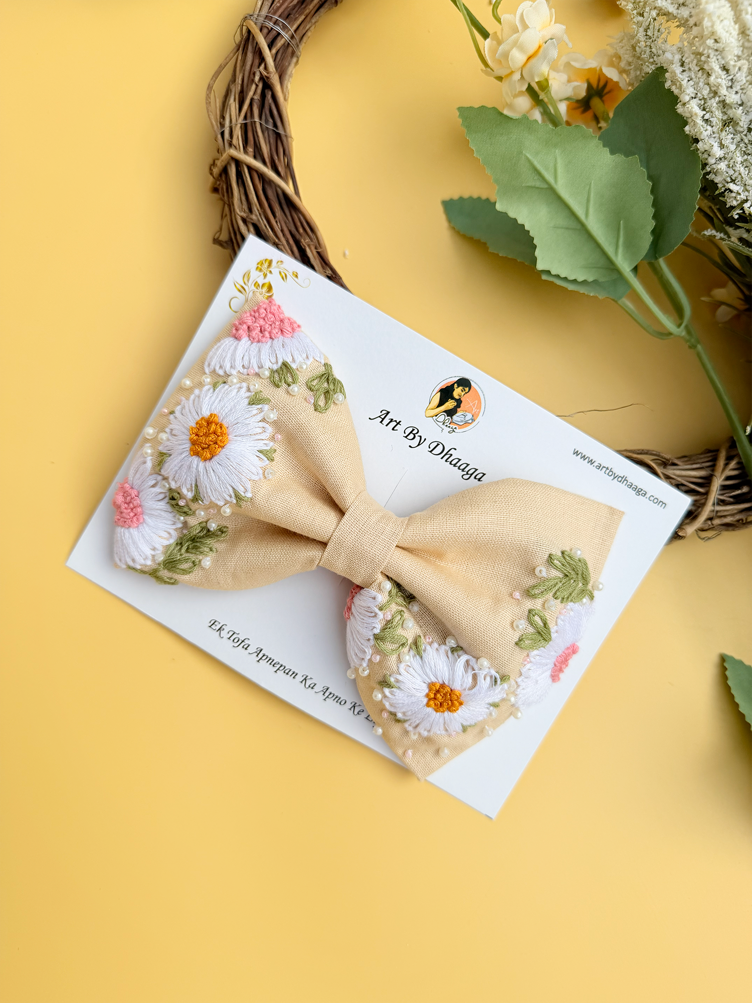 Aayra (Beige) – Hand-Embroidered Floral Hair Bow