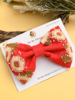 Aayra – Red is a striking hair bow crafted in a rich red shade, detailed with delicate hand-embroidered floral work that adds softness and elegance to its bold base.