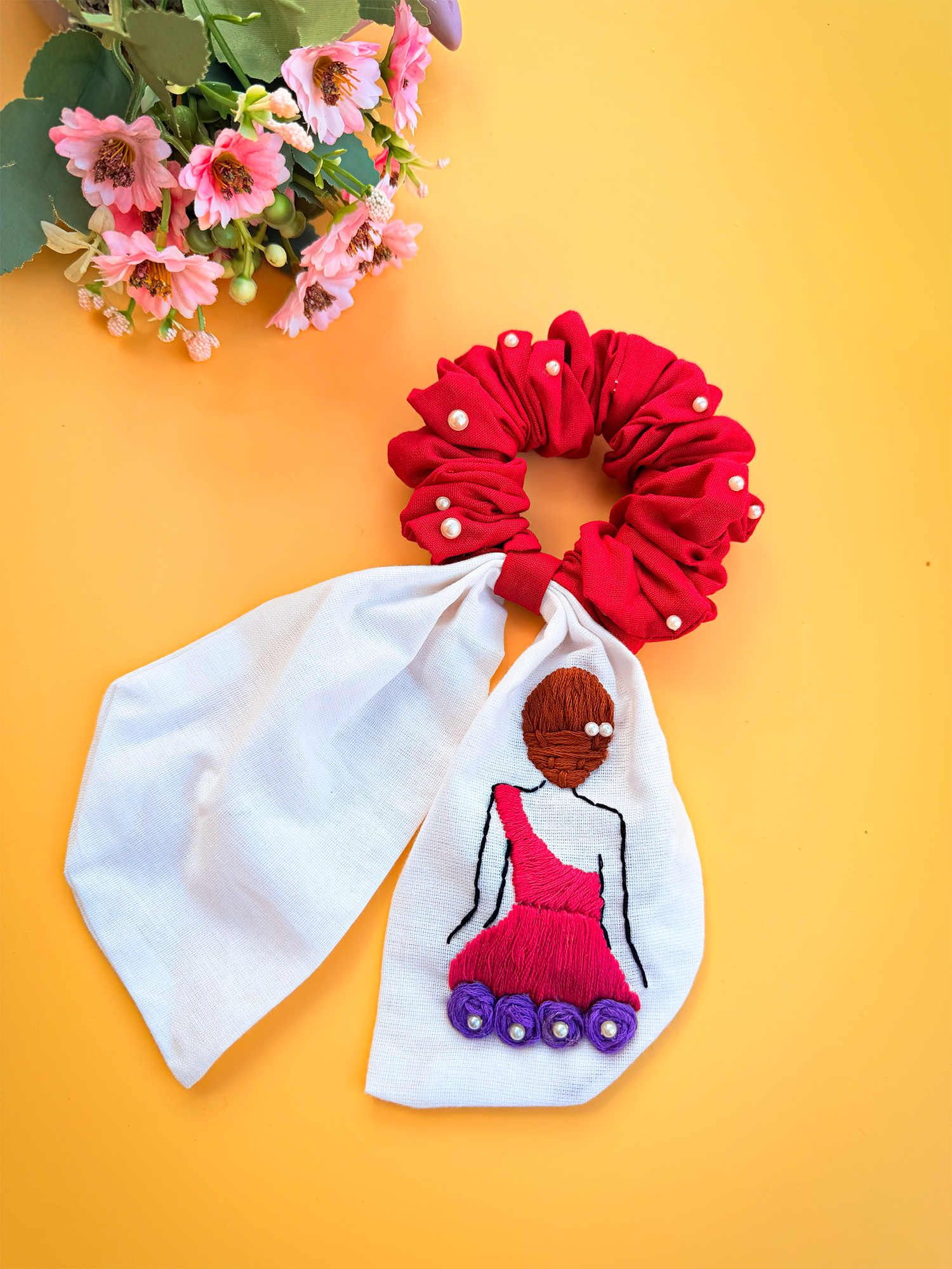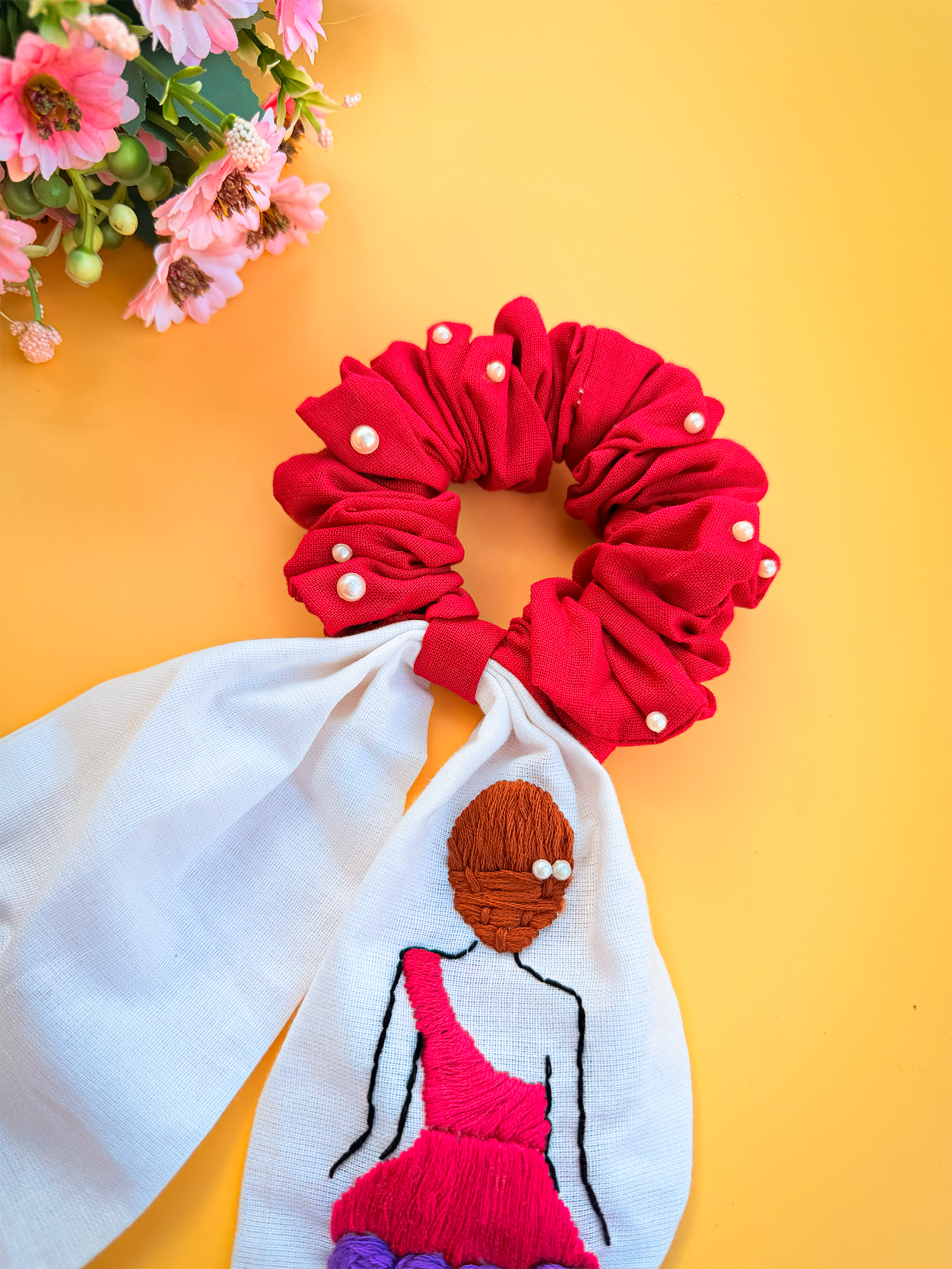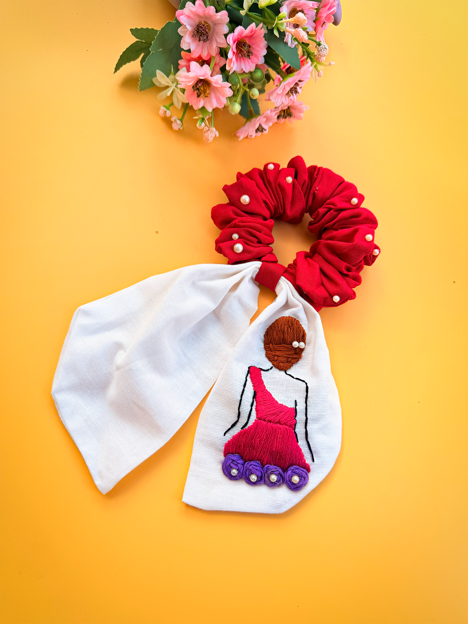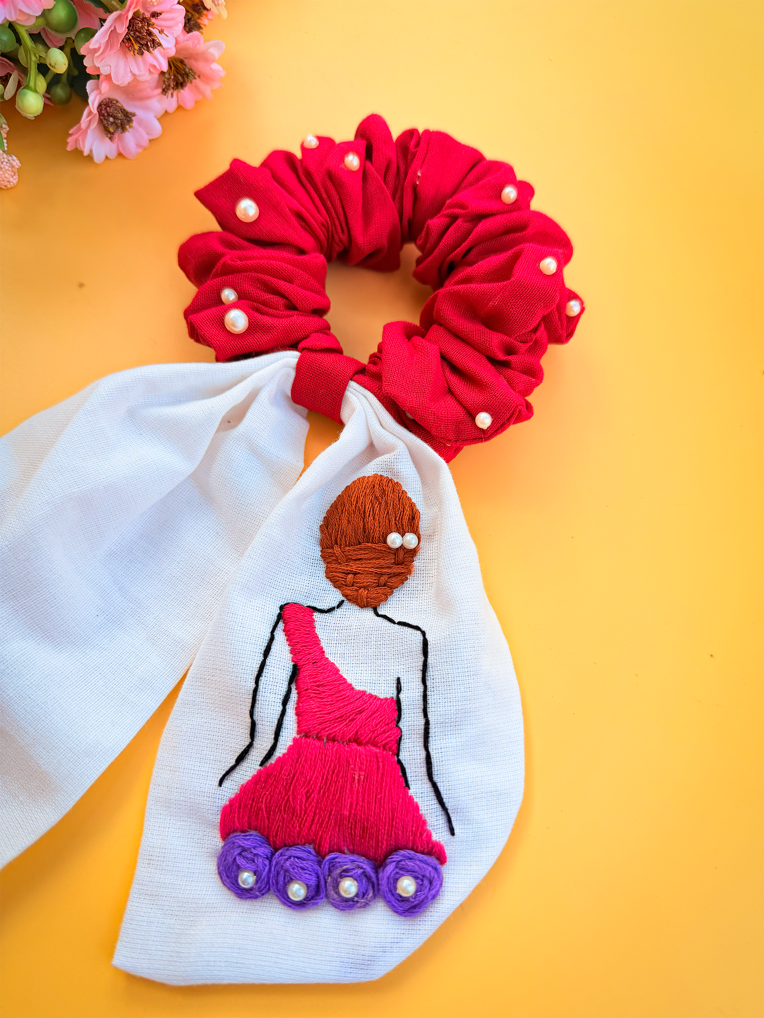 Ana is a beautifully crafted scrunchie with a soft tail, featuring an adorable hand-embroidered doll stitched with care. It’s the kind of accessory that instantly feels special — cute enough to notice, gentle enough to wear every day.