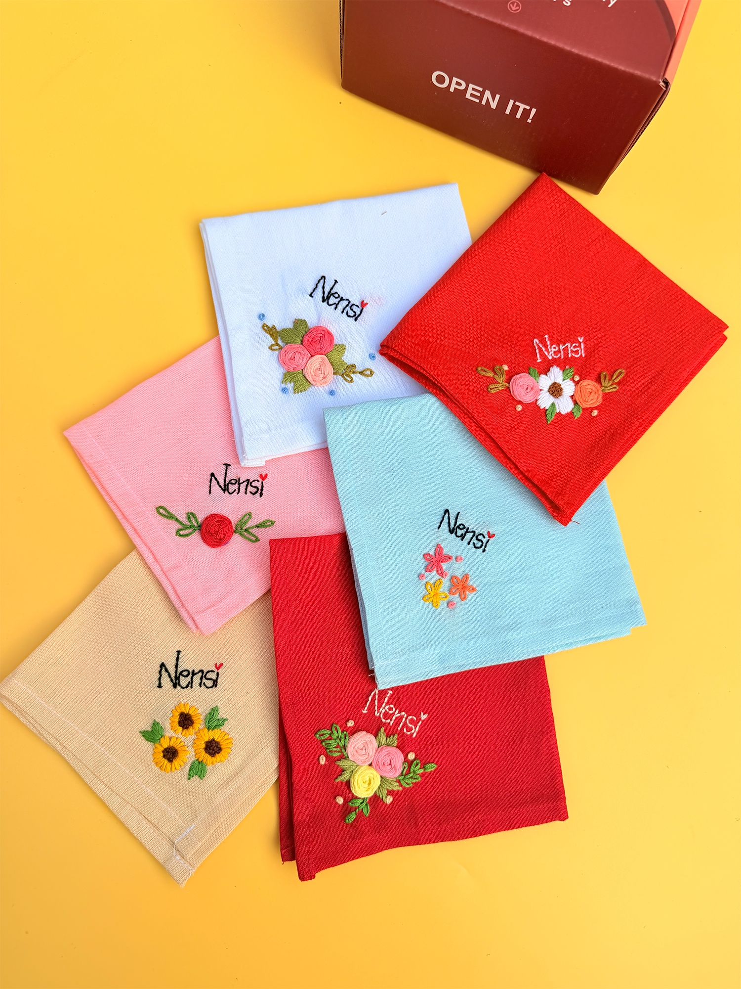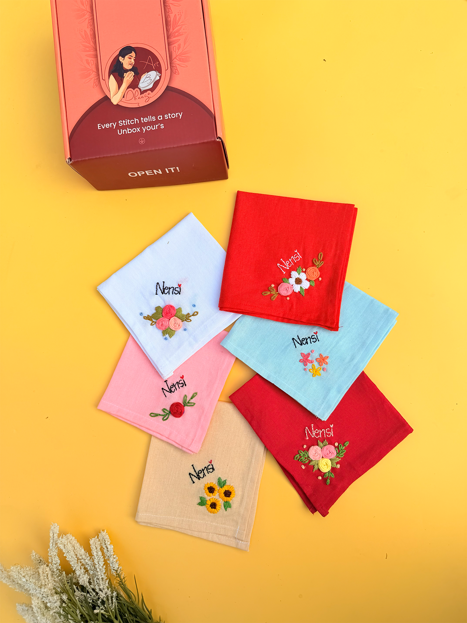 The Bridal Harmony Set is a thoughtfully curated collection of hand-embroidered hankeys, custom-made for a bride’s most special days. Designed in a range of soft and rich colours, each hankey is personalised and embroidered to complement different bridal outfits—so every look feels complete, coordinated, and meaningful.