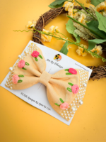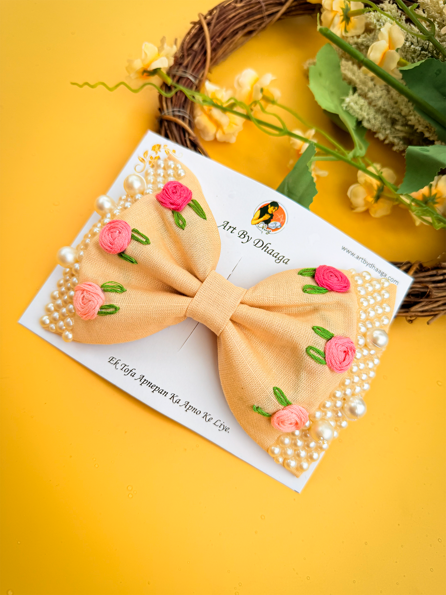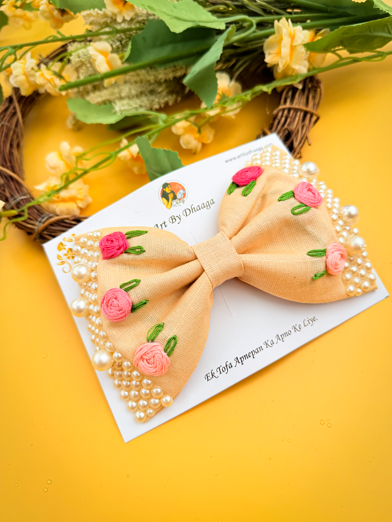 Noor Mini is a beautifully handcrafted bow made on a soft beige base, adorned with delicate hand-embroidered pink florals and finished with elegant pearl detailing along the edges.