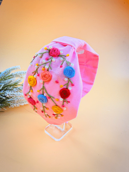 The deep black base makes the floral embroidery stand out beautifully, giving it a rich and premium look. Even with detailed work and a broad design, the headband remains comfortable and easy to wear.