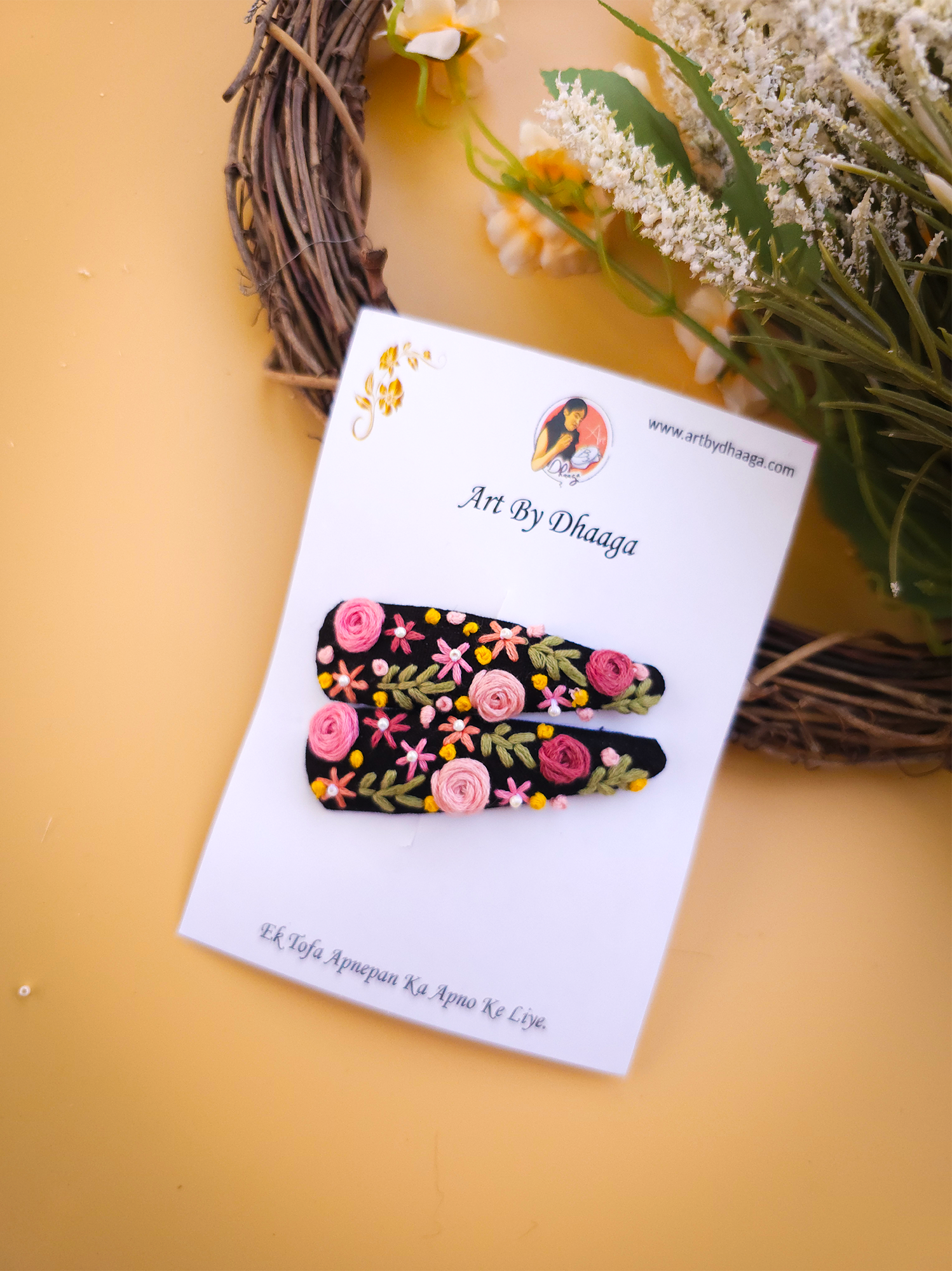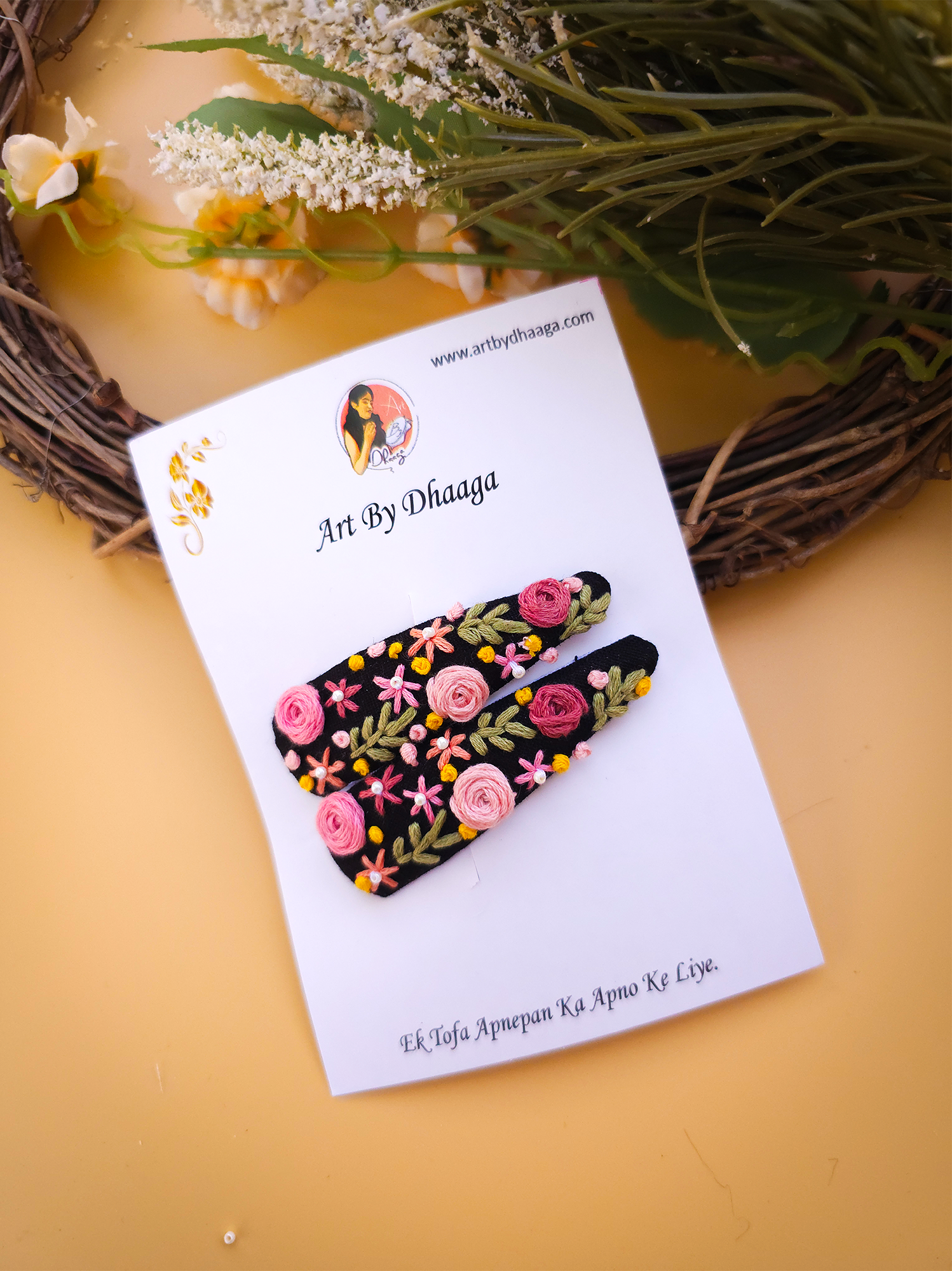 Eco-Friendly Packaging: At Art By Dhaaga, we are committed to sustainability. That’s why our embroidery tic tac hair clips come packaged in eco-friendly materials, we cannot completely cut using plastic but we try use less as much as we can ensuring that every aspect of your purchase aligns with our dedication to the planet.