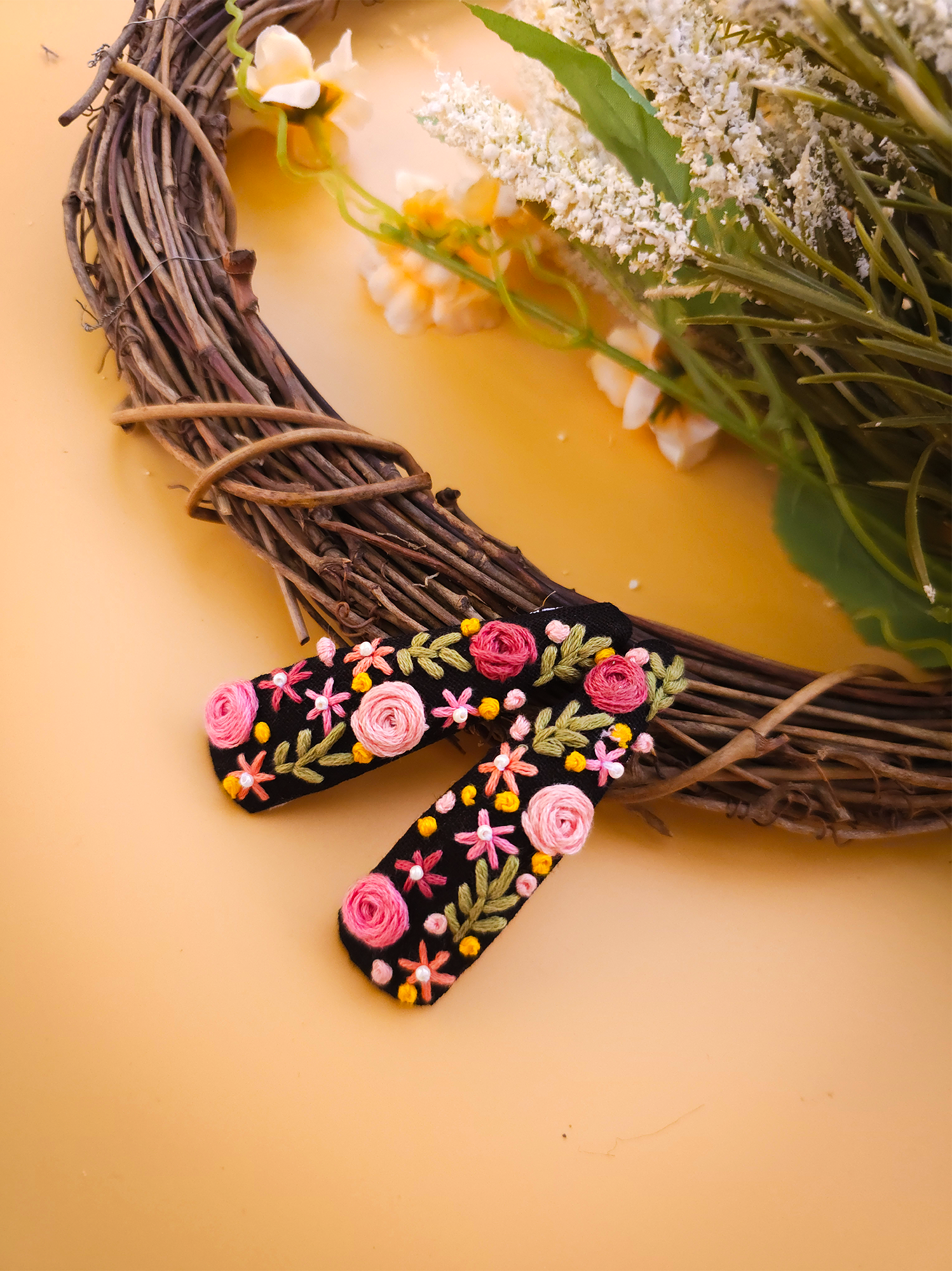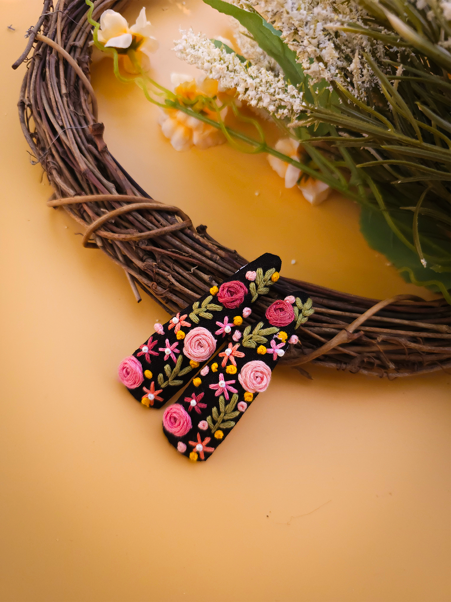 Materials: Our clips are crafted using premium-quality , thread, beads and fabric ensuring durability and longevity. The embroidery is meticulously stitched onto a sturdy base, guaranteeing that each piece is both beautiful and resilient. We prioritize eco-friendly materials, striving to minimize our environmental footprint while delivering exceptional products.