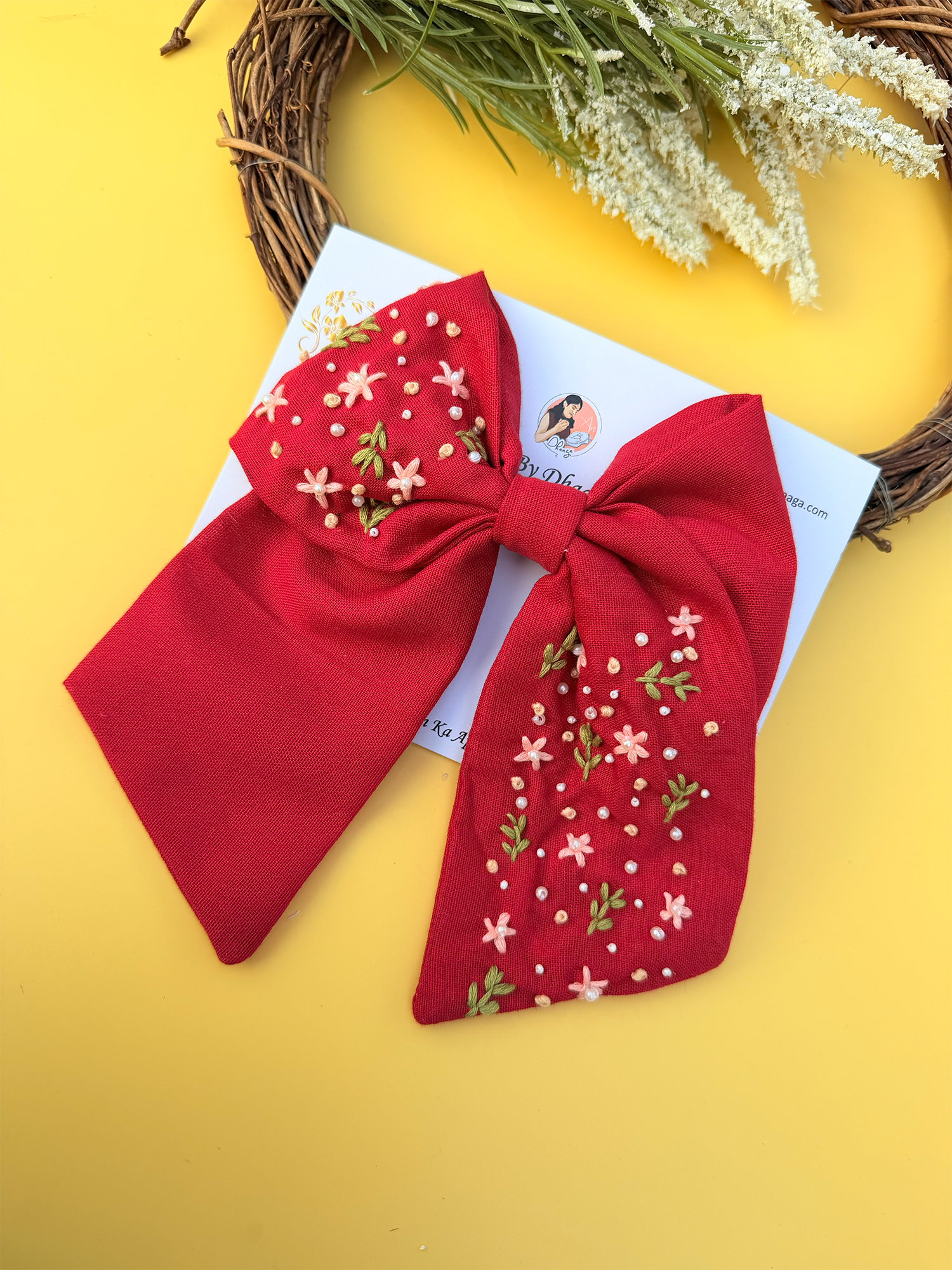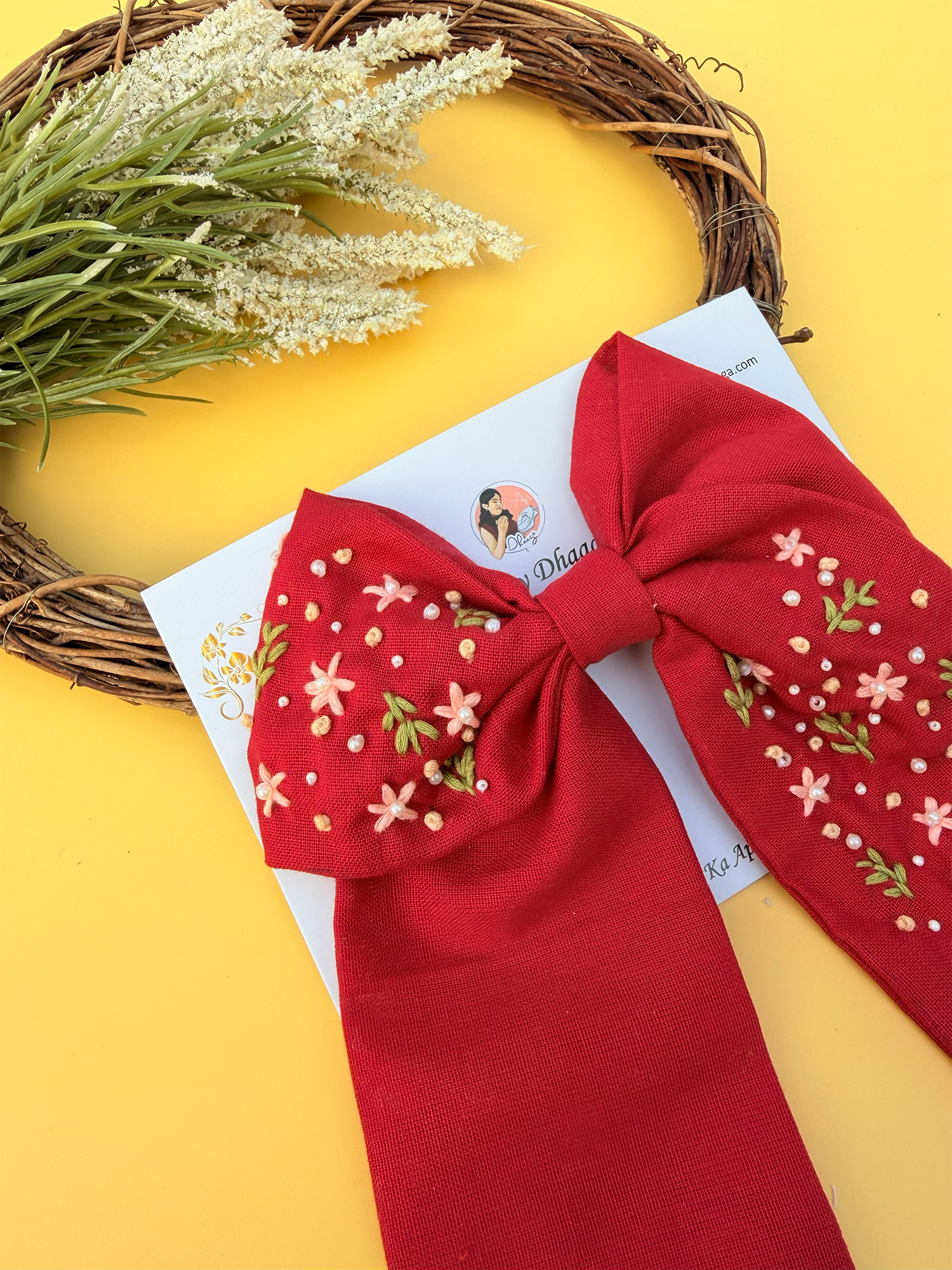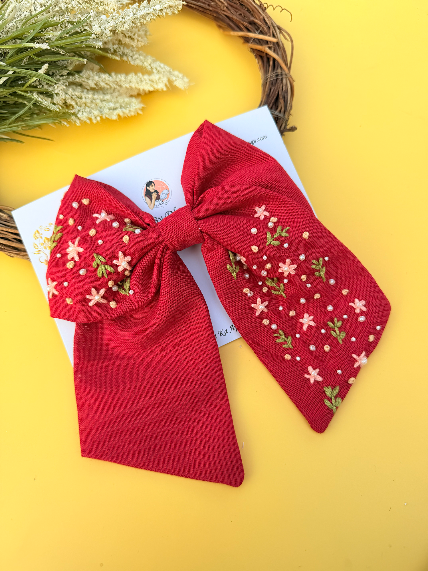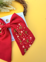 Inspired by grace, prosperity, and timeless beauty, LAKSHMI is a statement hand-embroidered bow crafted to bring elegance to every look. Set on a rich red base and detailed with delicate floral embroidery, this bow reflects traditional charm blended with modern femininity.