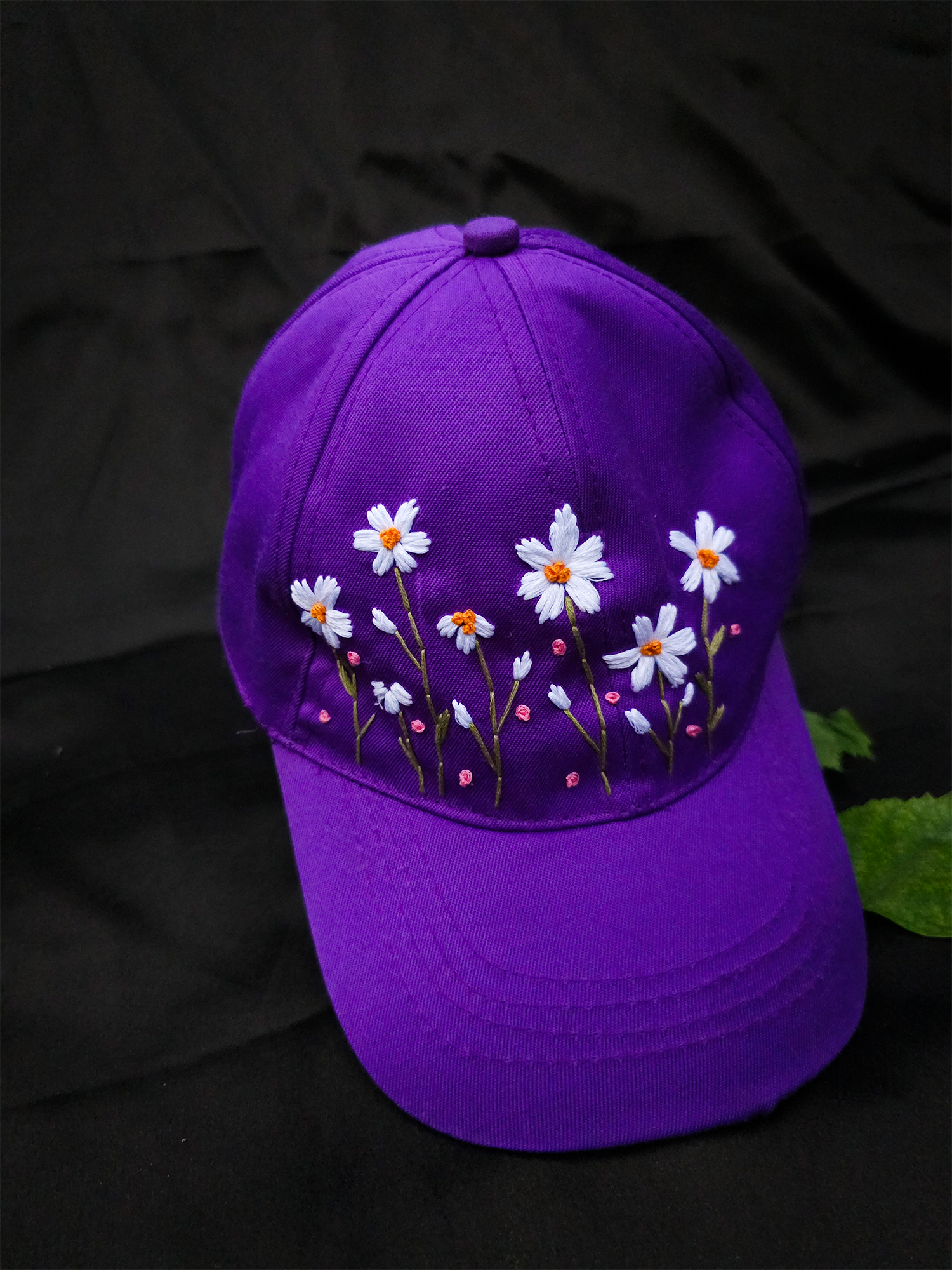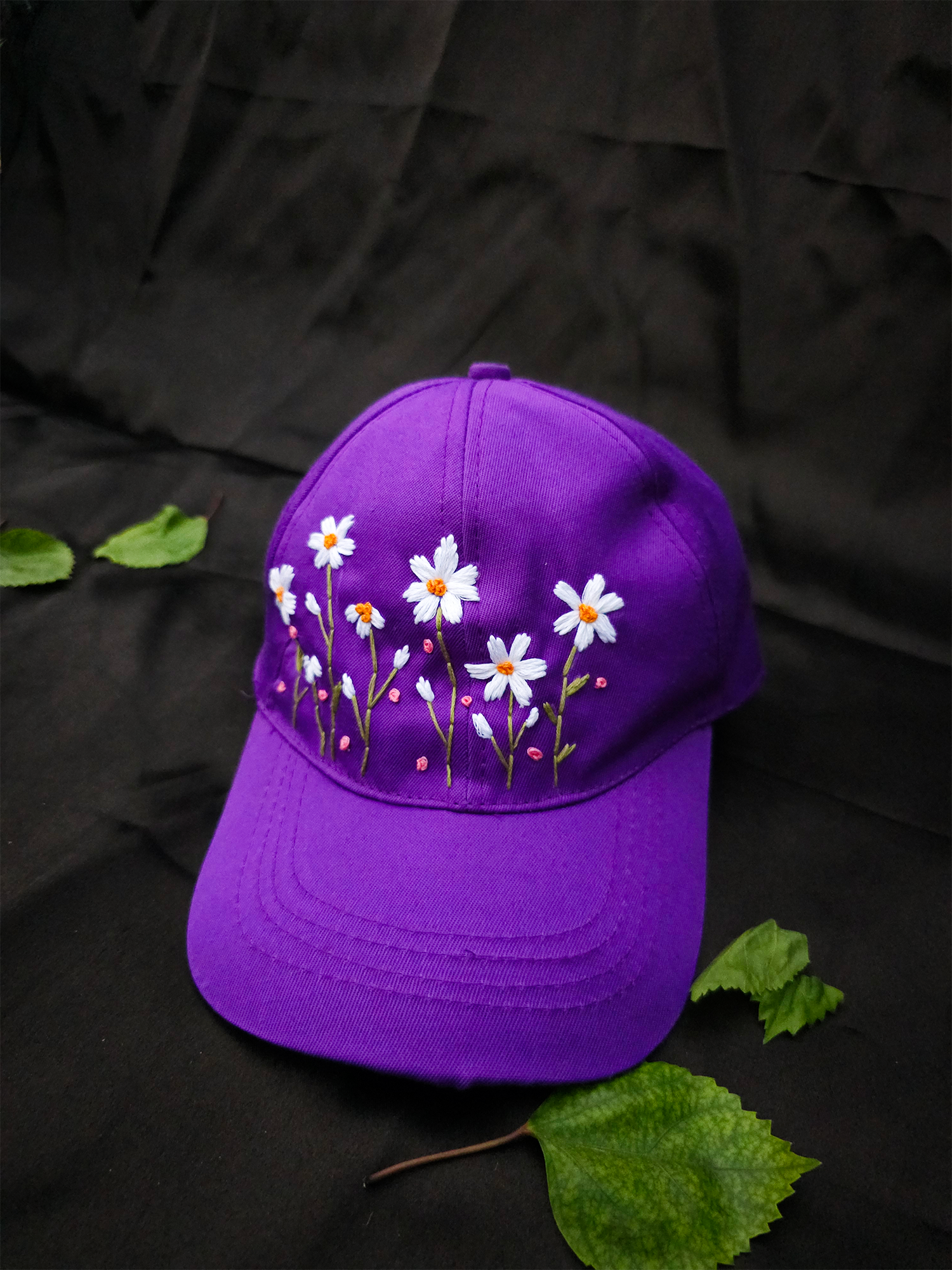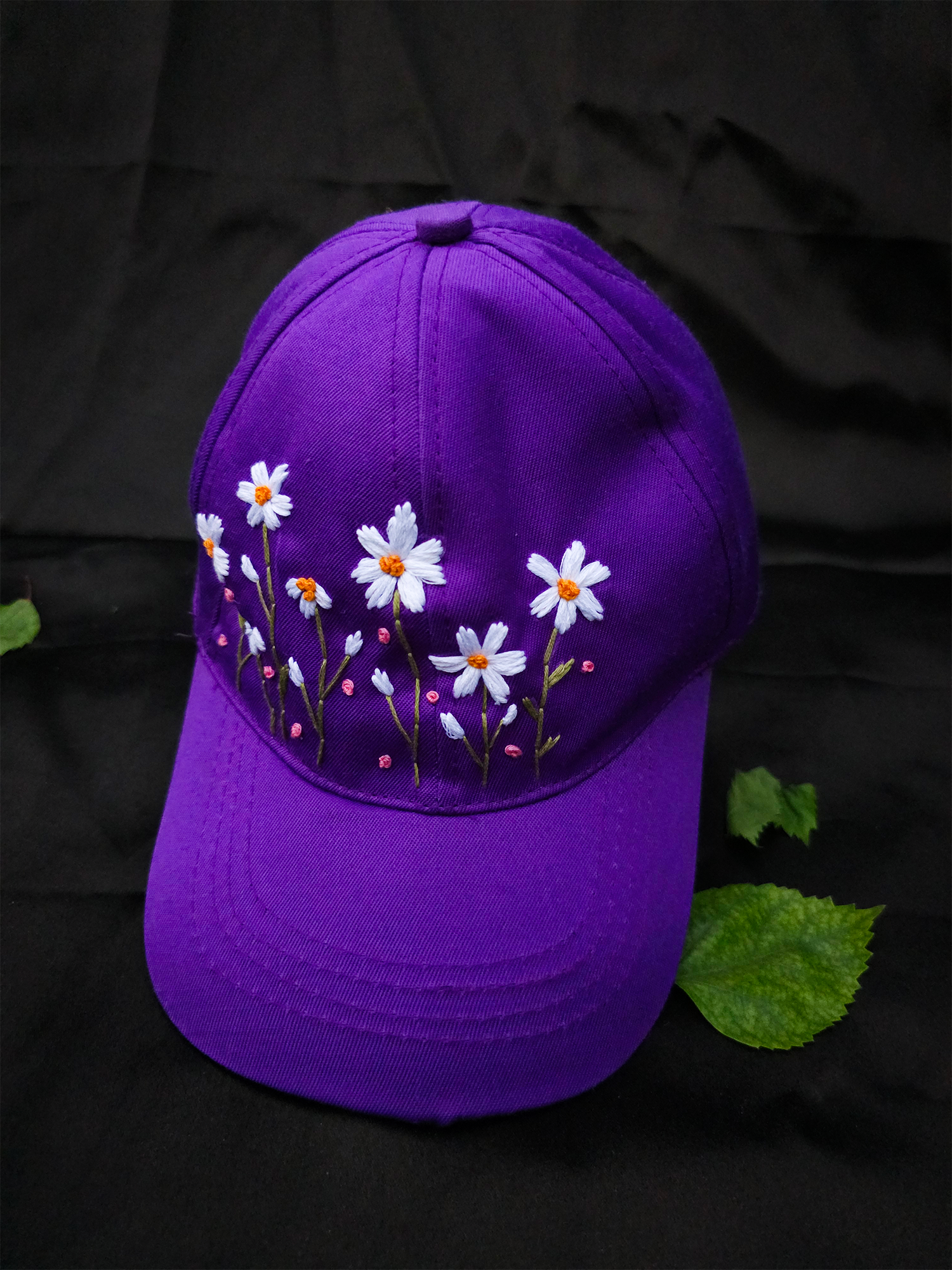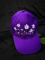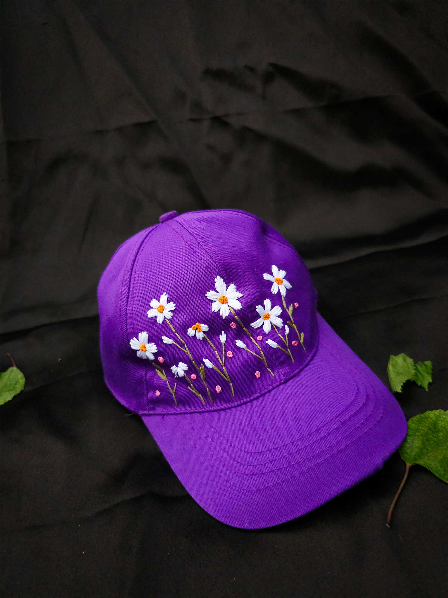 Lavender Breeze is a lightweight purple summer cap, beautifully hand-embroidered with delicate white floral designs. It’s the perfect blend of cool comfort and artisanal detail — keeping you shaded while adding a touch of elegance to your outfit.
