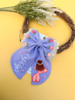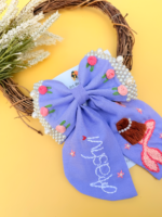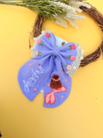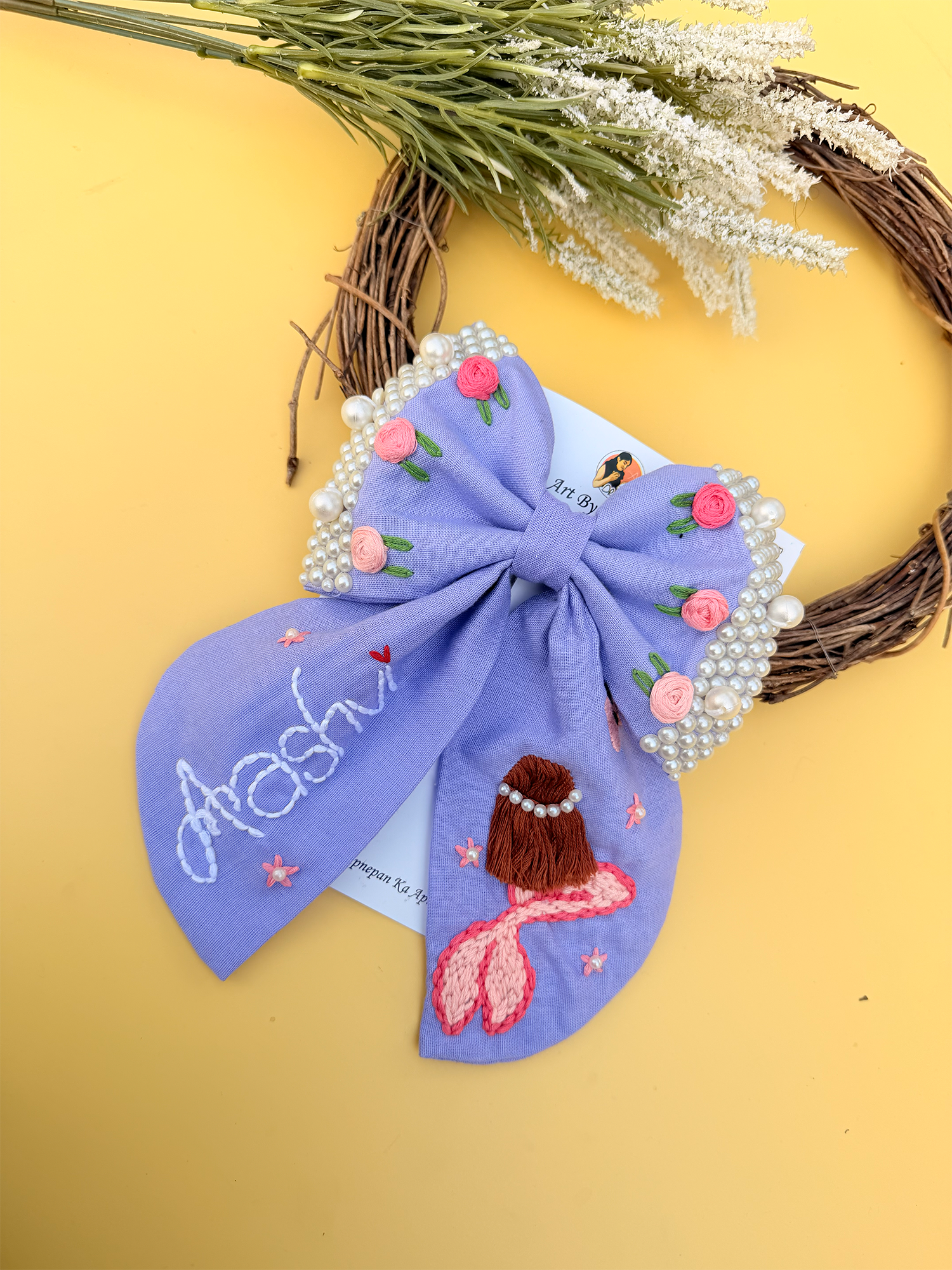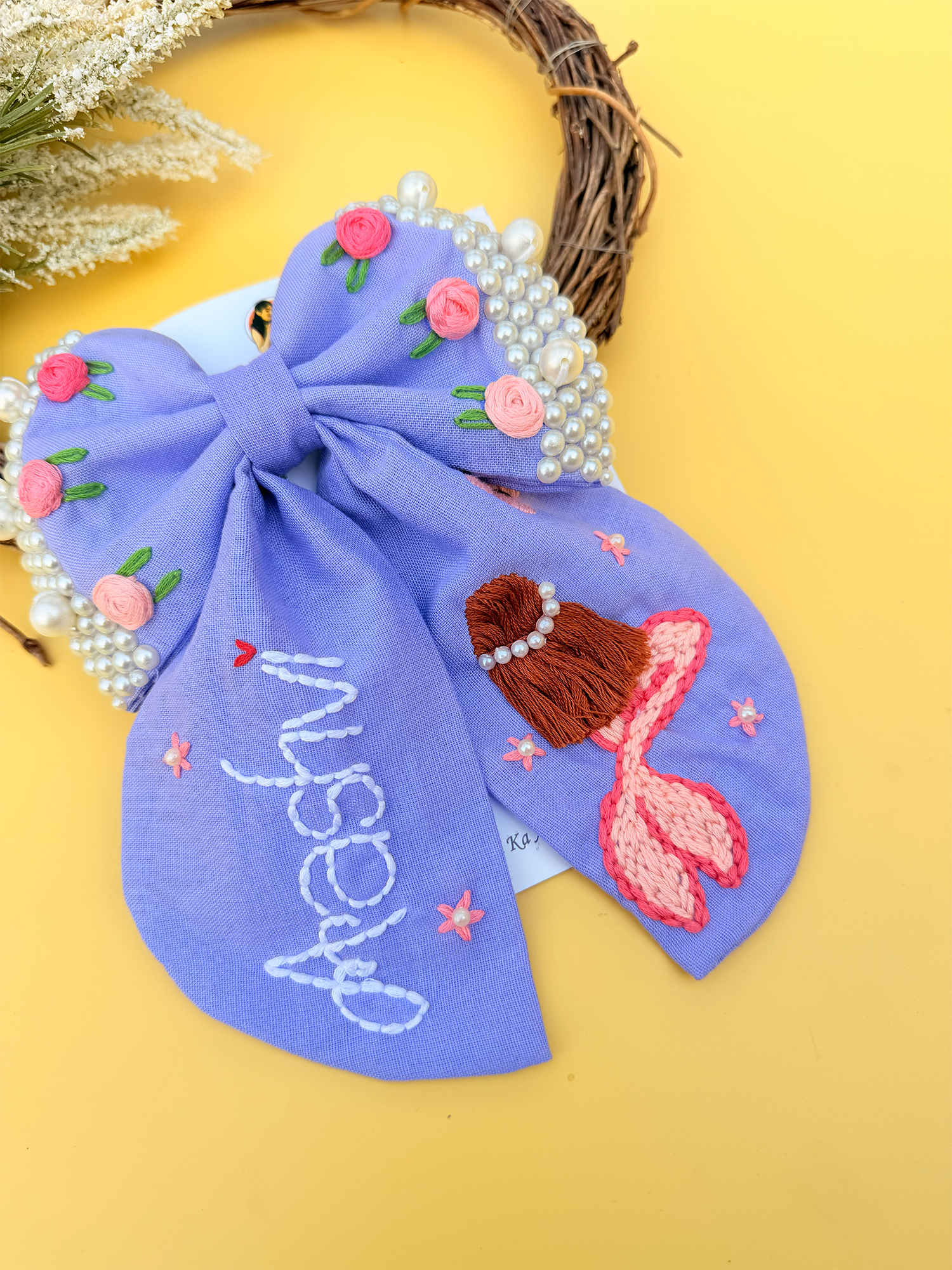 Mishti is a handcrafted bow that feels like a gentle love story stitched into fabric. Set in a soothing lavender base, this bow features delicate floral accents, pearl detailing, and a beautifully hand-embroidered girl motifβfinished with the name βMishtiβ lovingly stitched on the flowing tail.