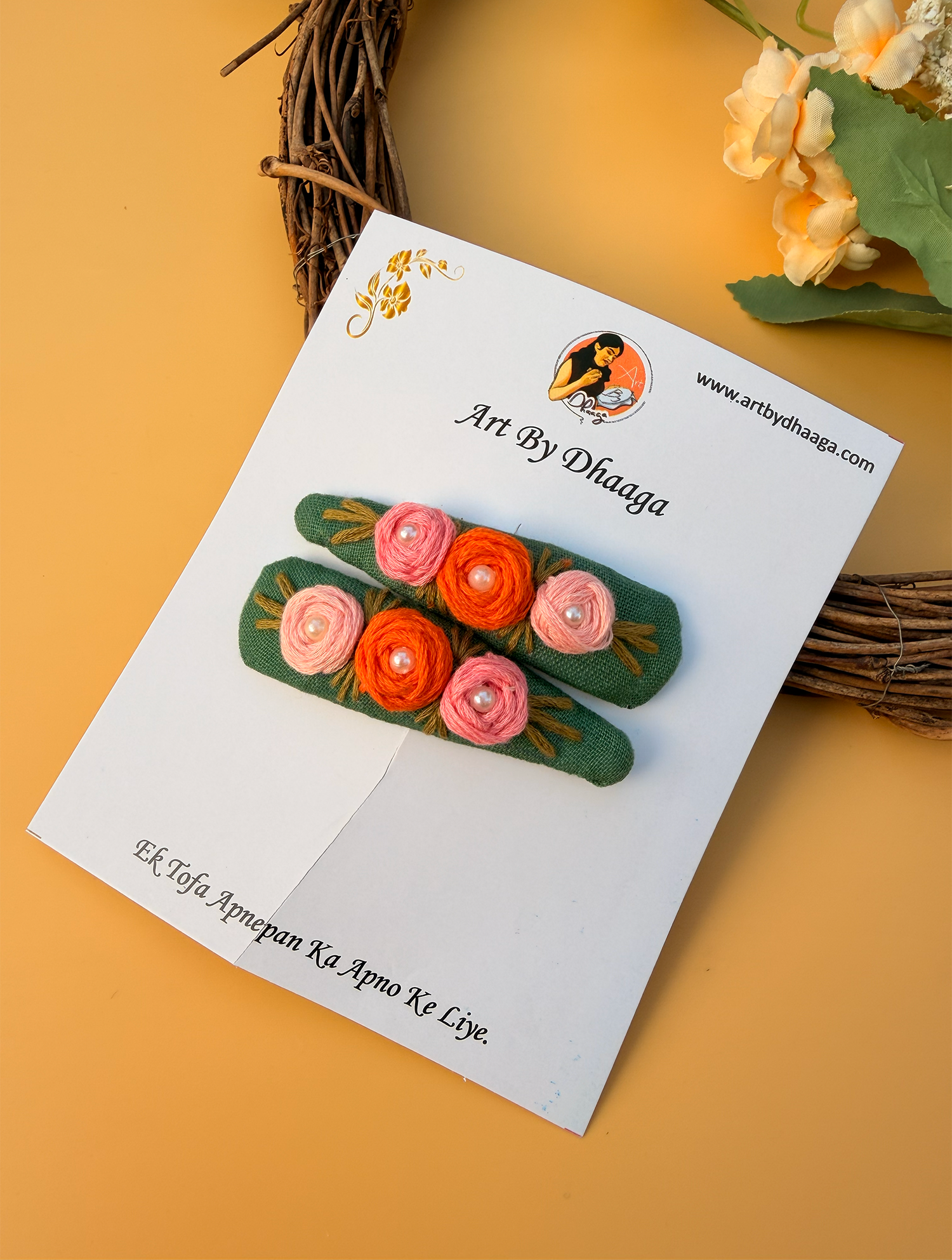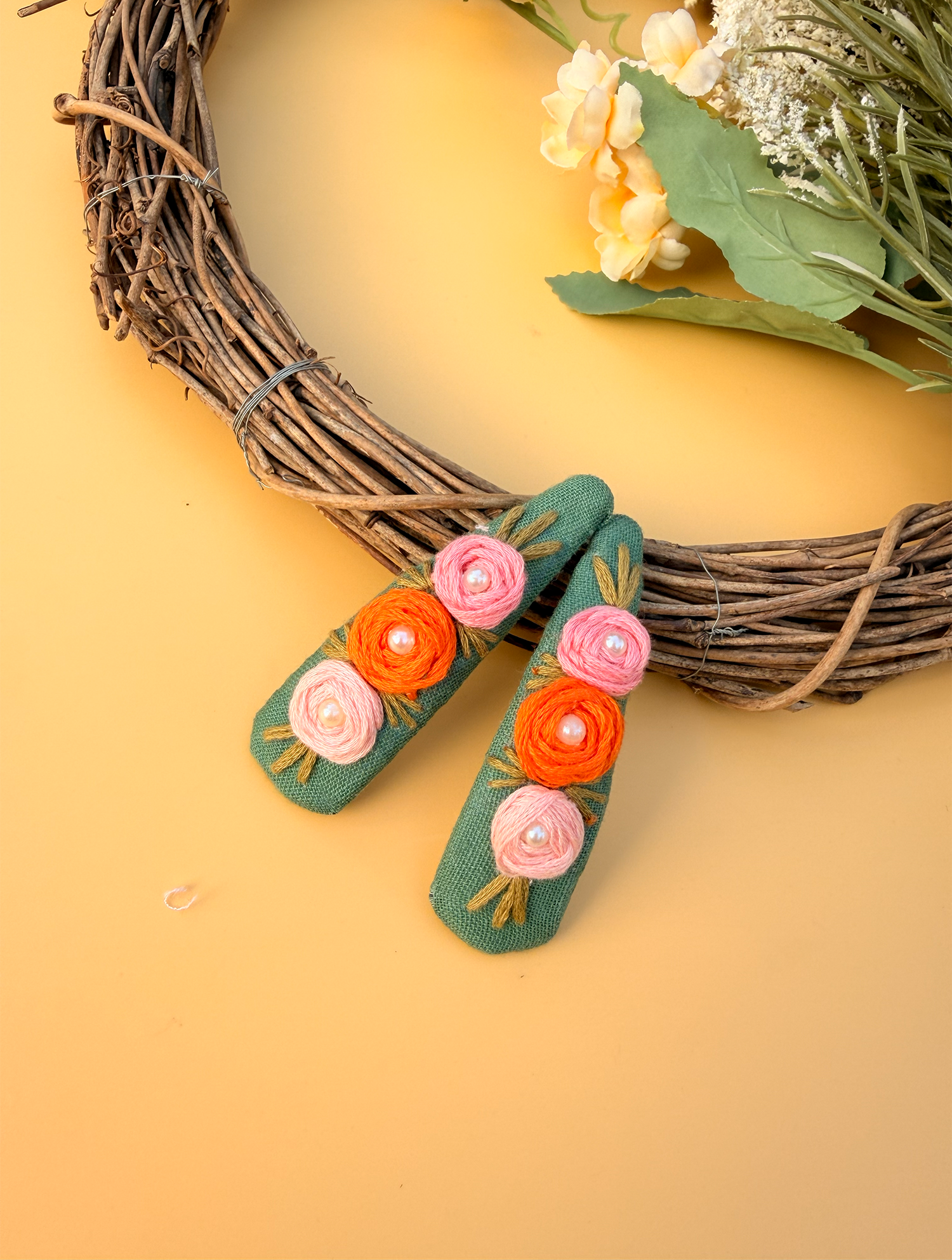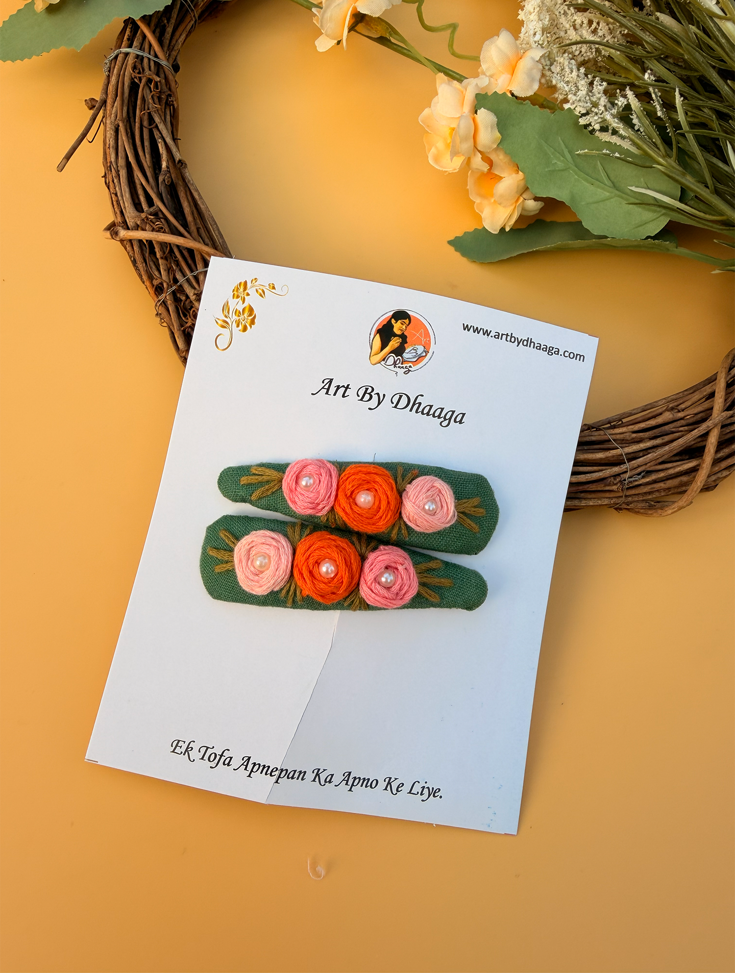Niya – Green is a lovingly handcrafted tic tac set designed on a soft green base, featuring delicate hand-embroidered floral details that bring a calm, nature-inspired charm to everyday hairstyles.