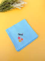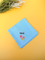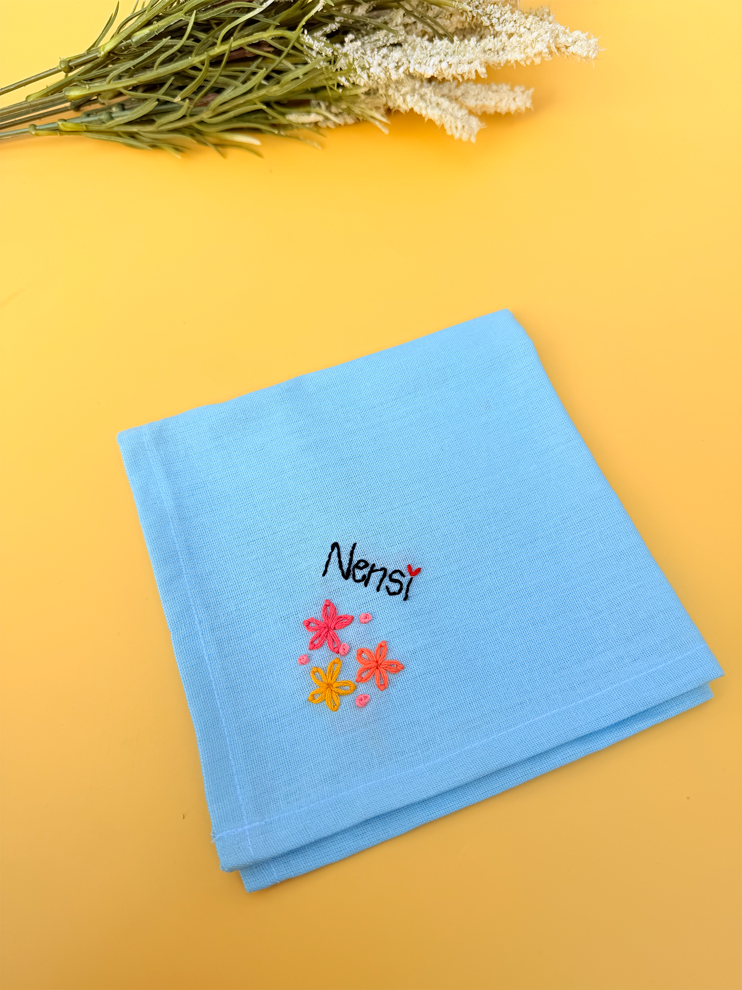 Sky Blooms is a hand-embroidered hankey crafted on a soothing sky-blue base, accented with fine floral embroidery that adds a playful yet graceful charm. The cool tone gives it a fresh, modern feel, while the handcrafted florals keep it warm and timeless.