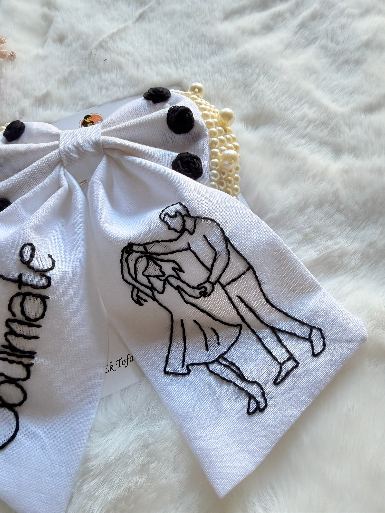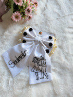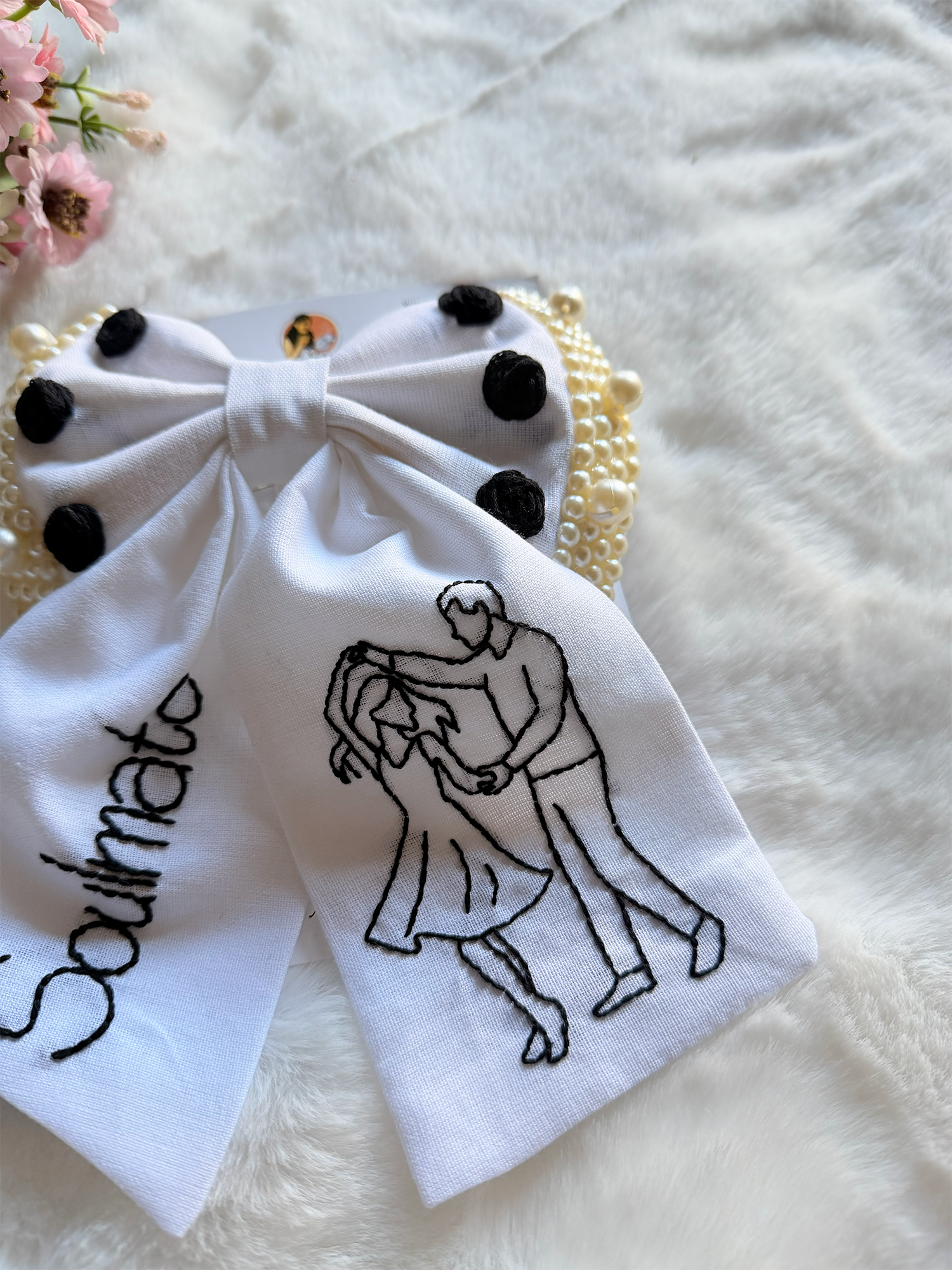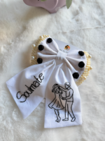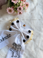 Soulmate is a handcrafted statement bow that celebrates connection, togetherness, and timeless love. Designed on a classic white base, this bow features hand-embroidered typography paired with a delicate couple line-art motif—making it an accessory that speaks straight from the heart.