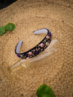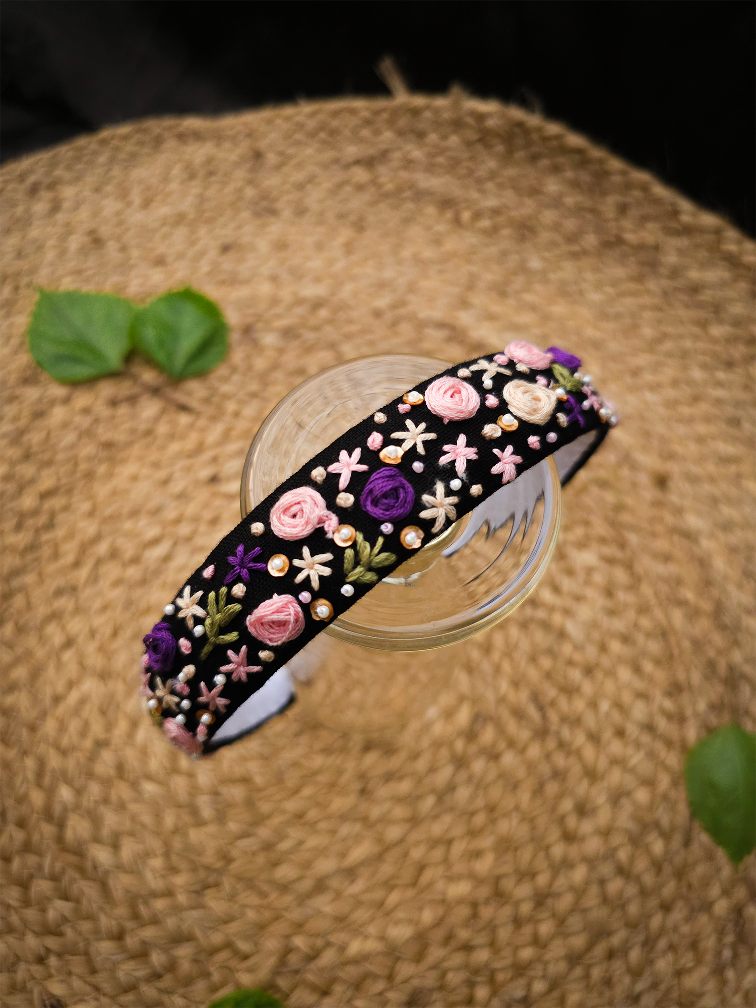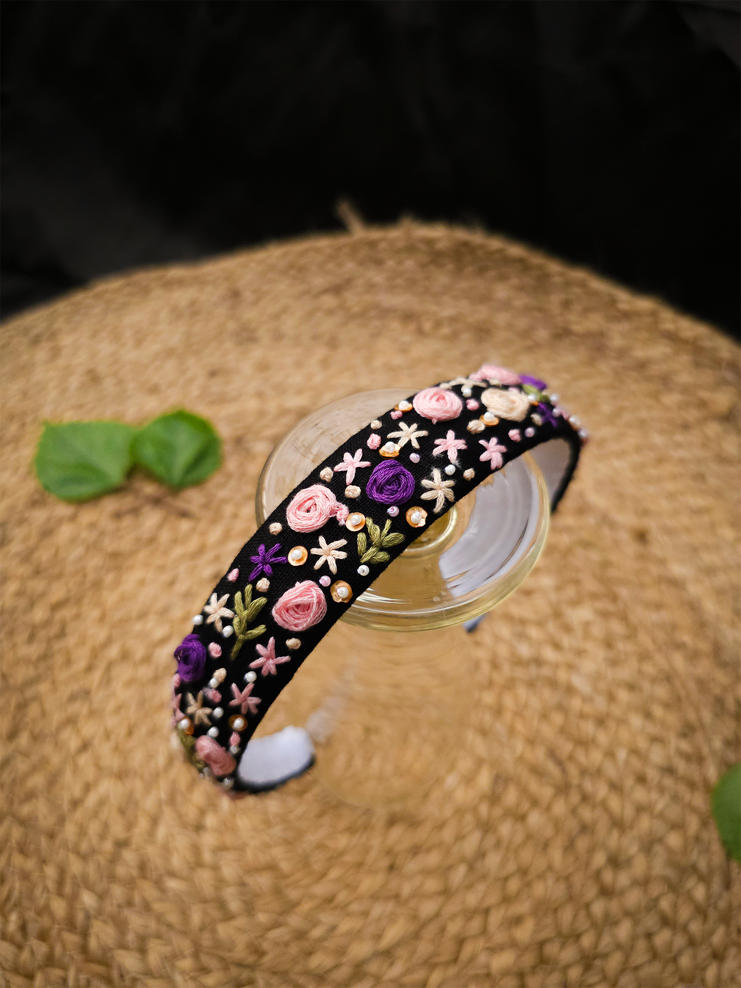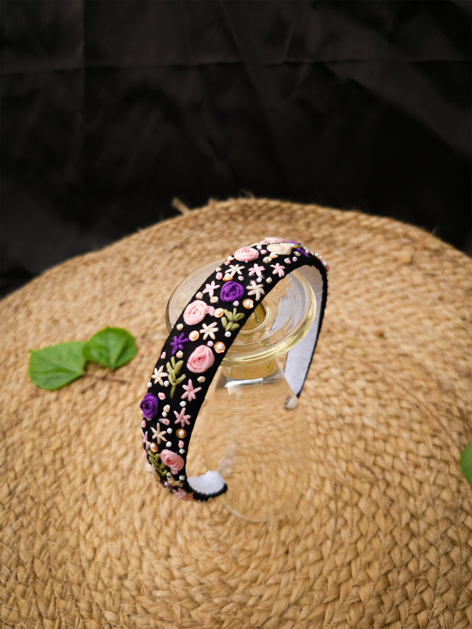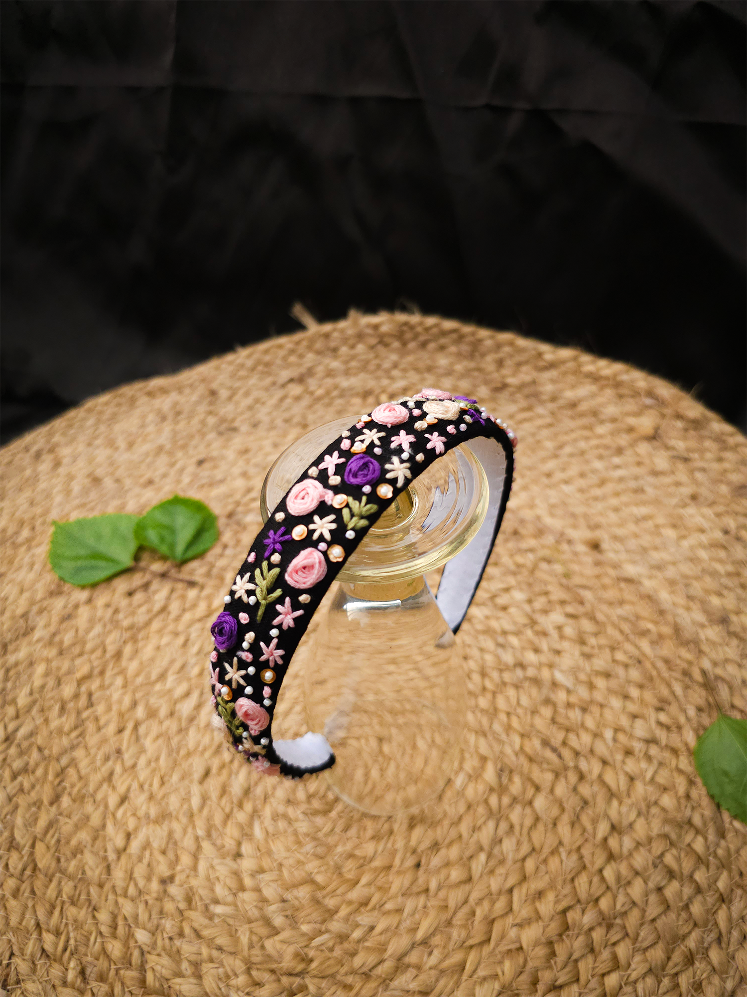 Twilight Bloom is a hand-embroidered headband featuring delicate purple and blush-pink floral motifs on a deep black base — capturing the beauty of flowers under the soft glow of evening skies.