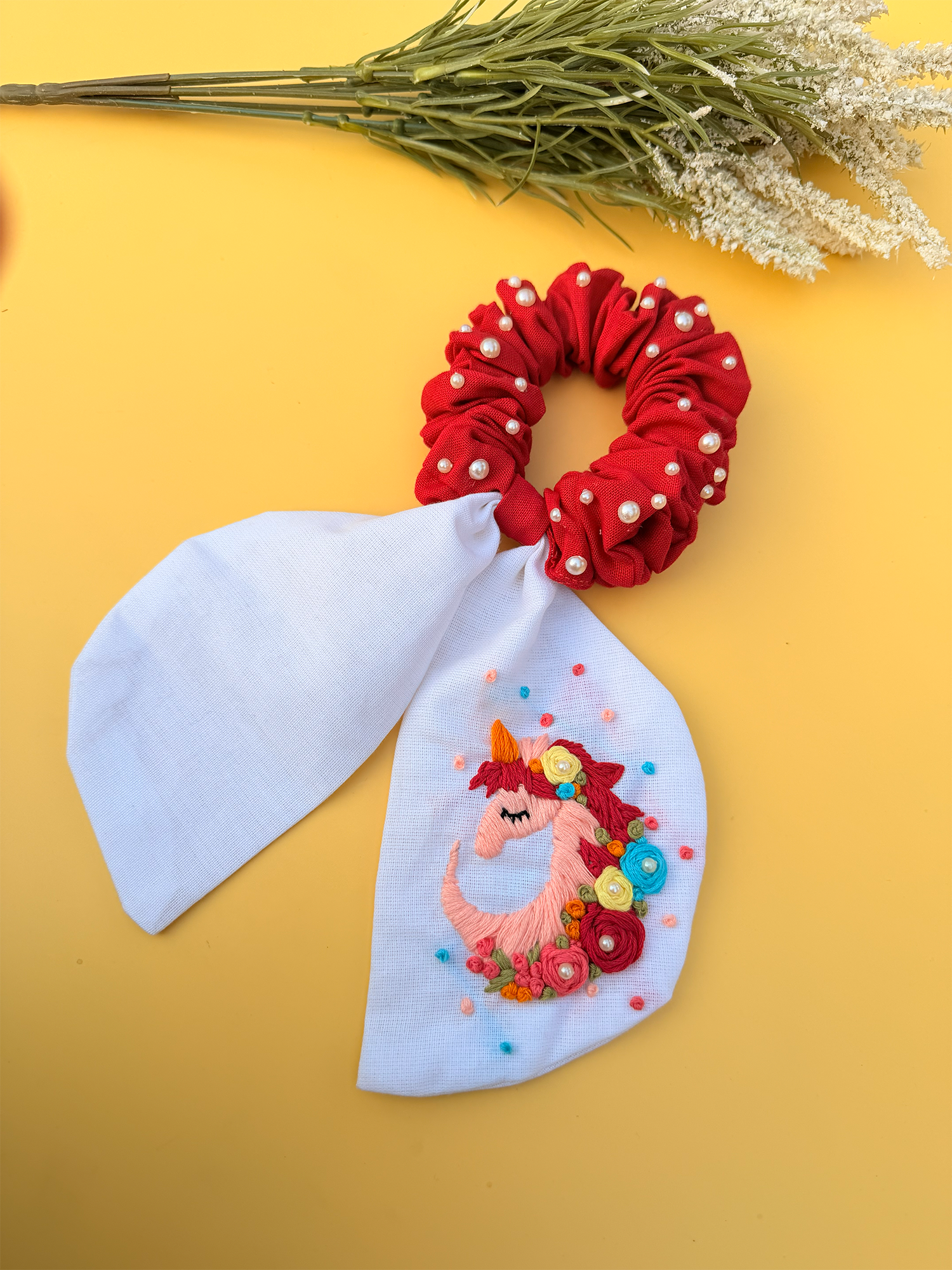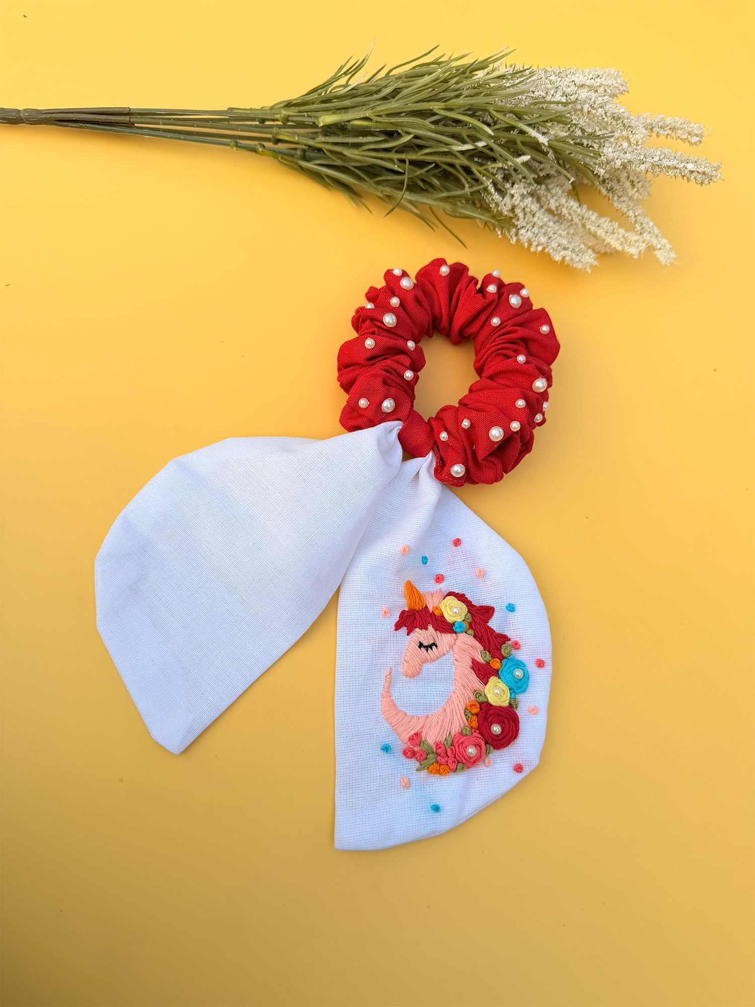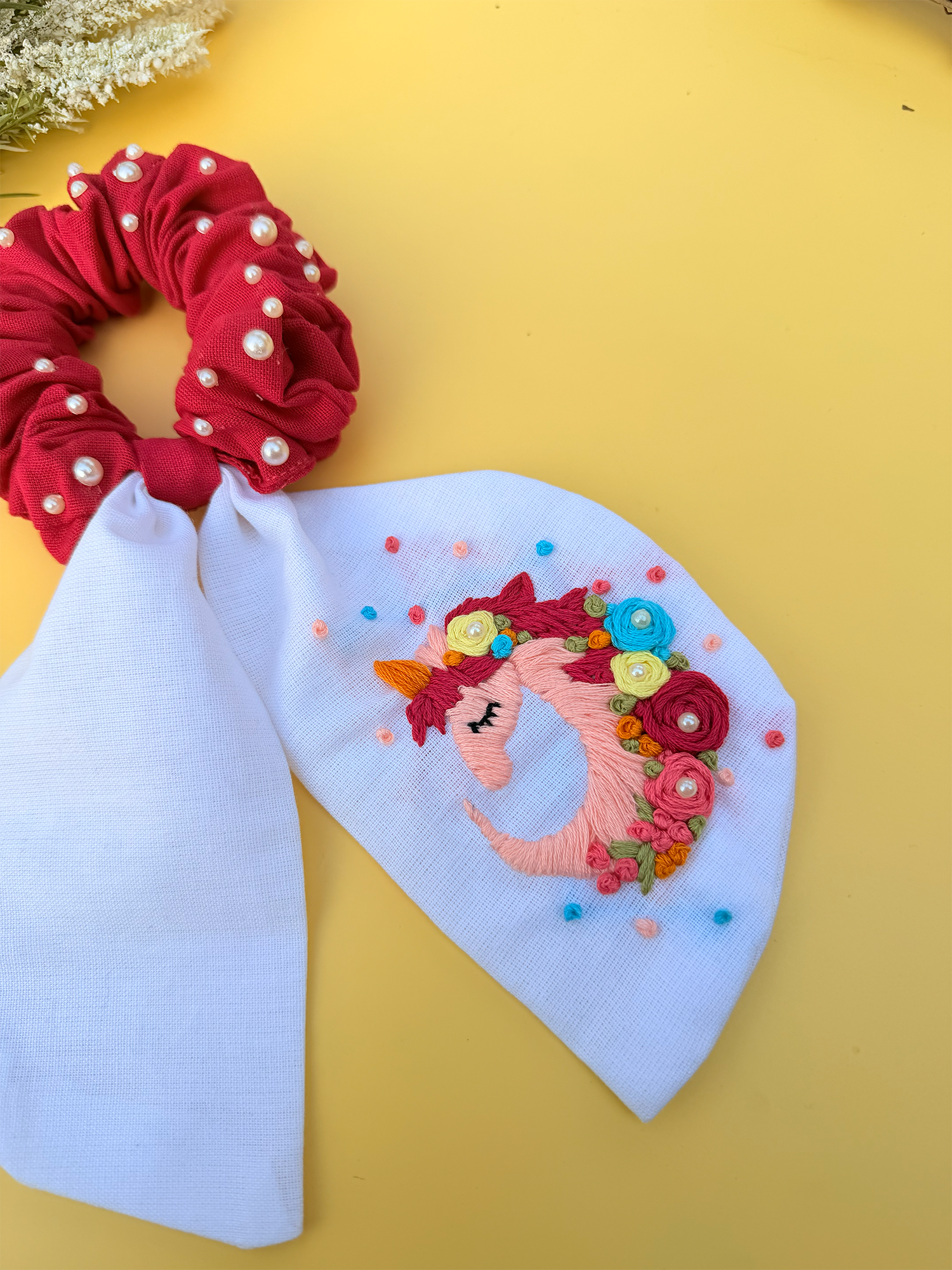 Unicorn Dream is a handcrafted tail scrunchie bow designed to bring a little magic into everyday hairstyles. Featuring a vibrant hand-embroidered unicorn motif surrounded by cheerful floral detailing, this piece feels straight out of a fairytale.