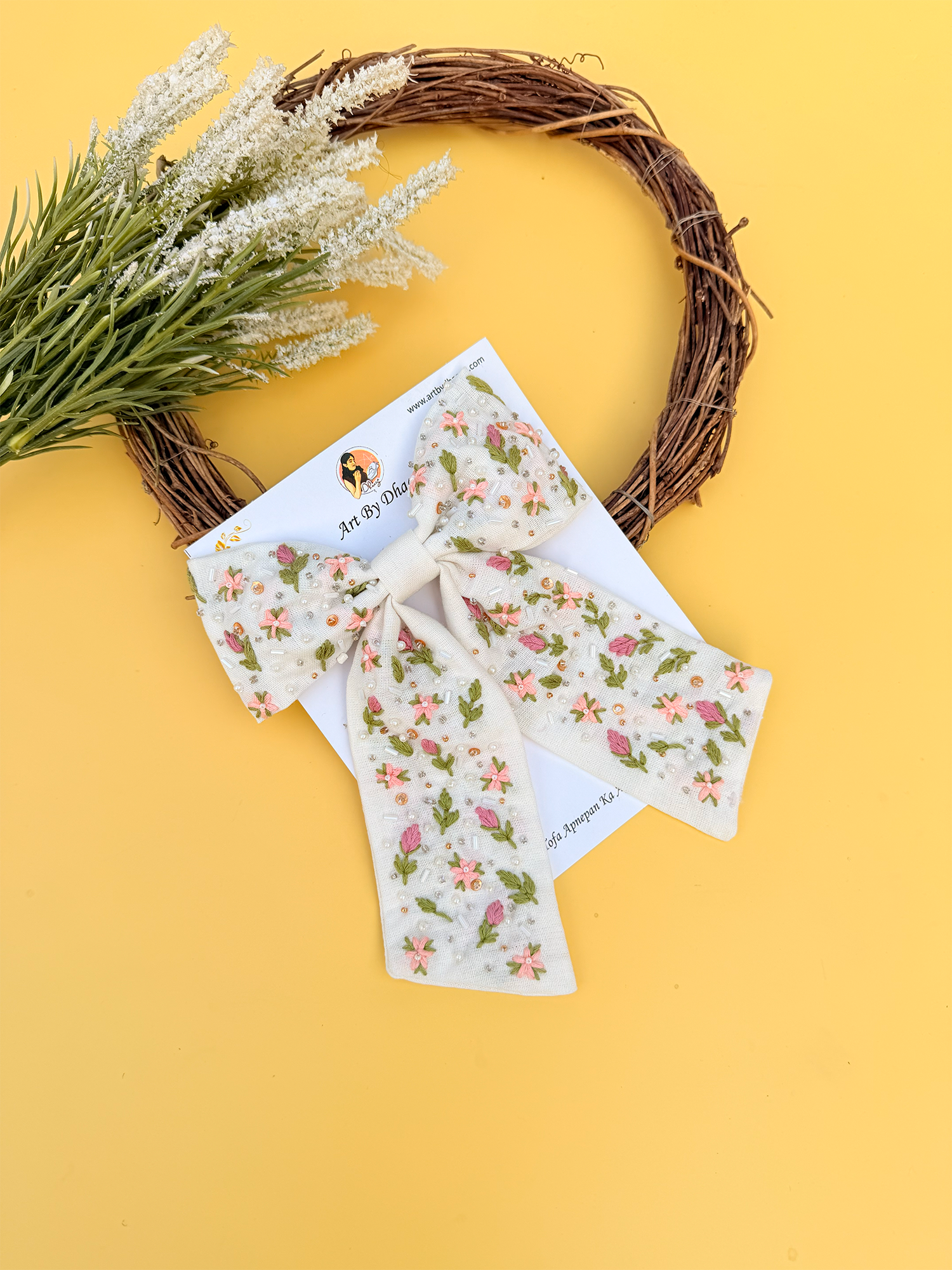 Vasundhara is a handcrafted floral tail bow inspired by nature’s quiet beauty. Set on a soft ivory base, this bow features fine hand-embroidered florals scattered gently across flowing tails—like blossoms resting on morning dew.