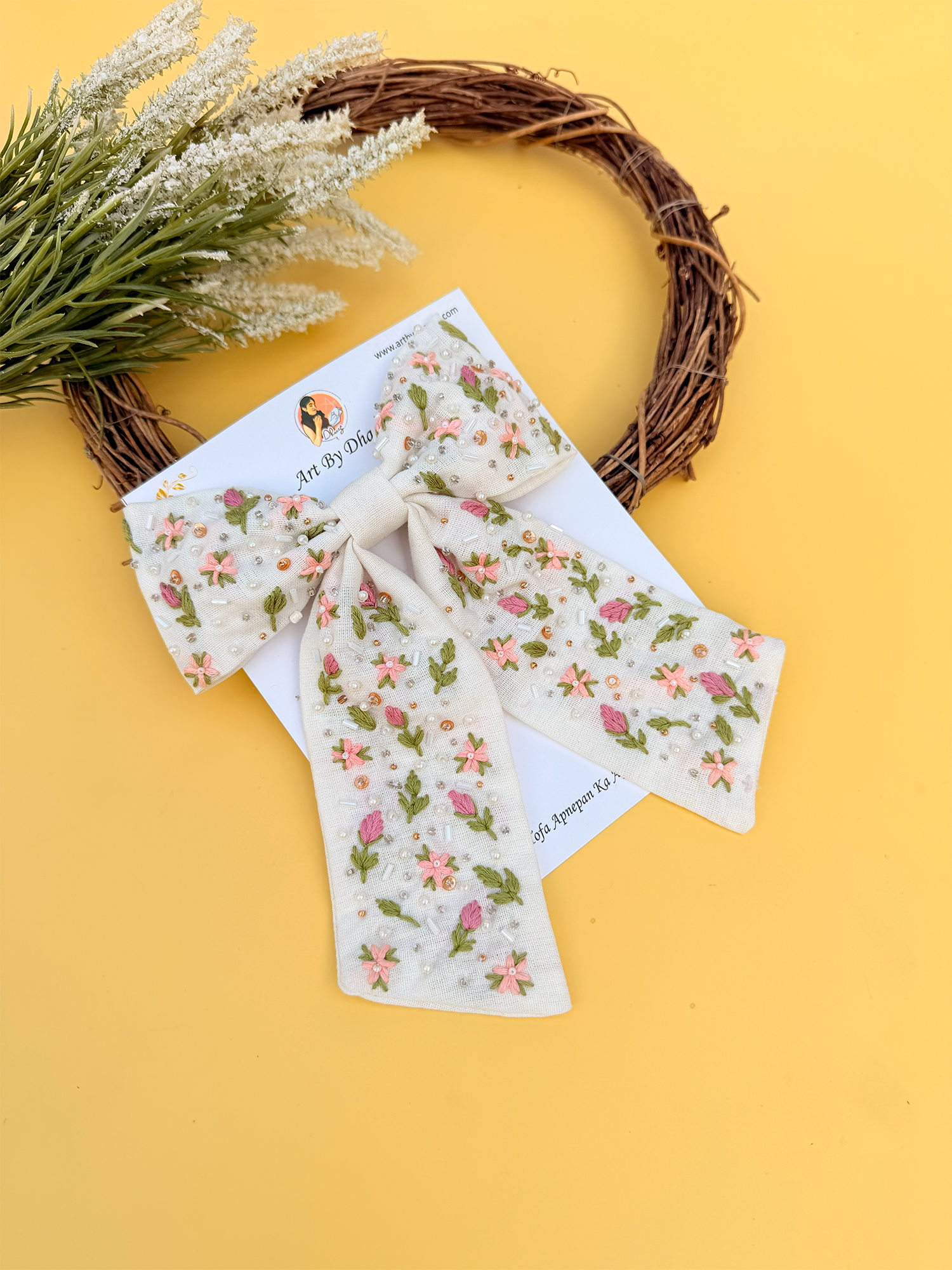 Vasundhara 🌿 – Hand-Embroidered Floral Tail Bow