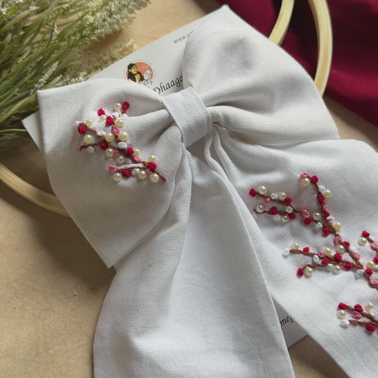 Cherry Blossom Hand Embroidered Bow Hair Clip – White