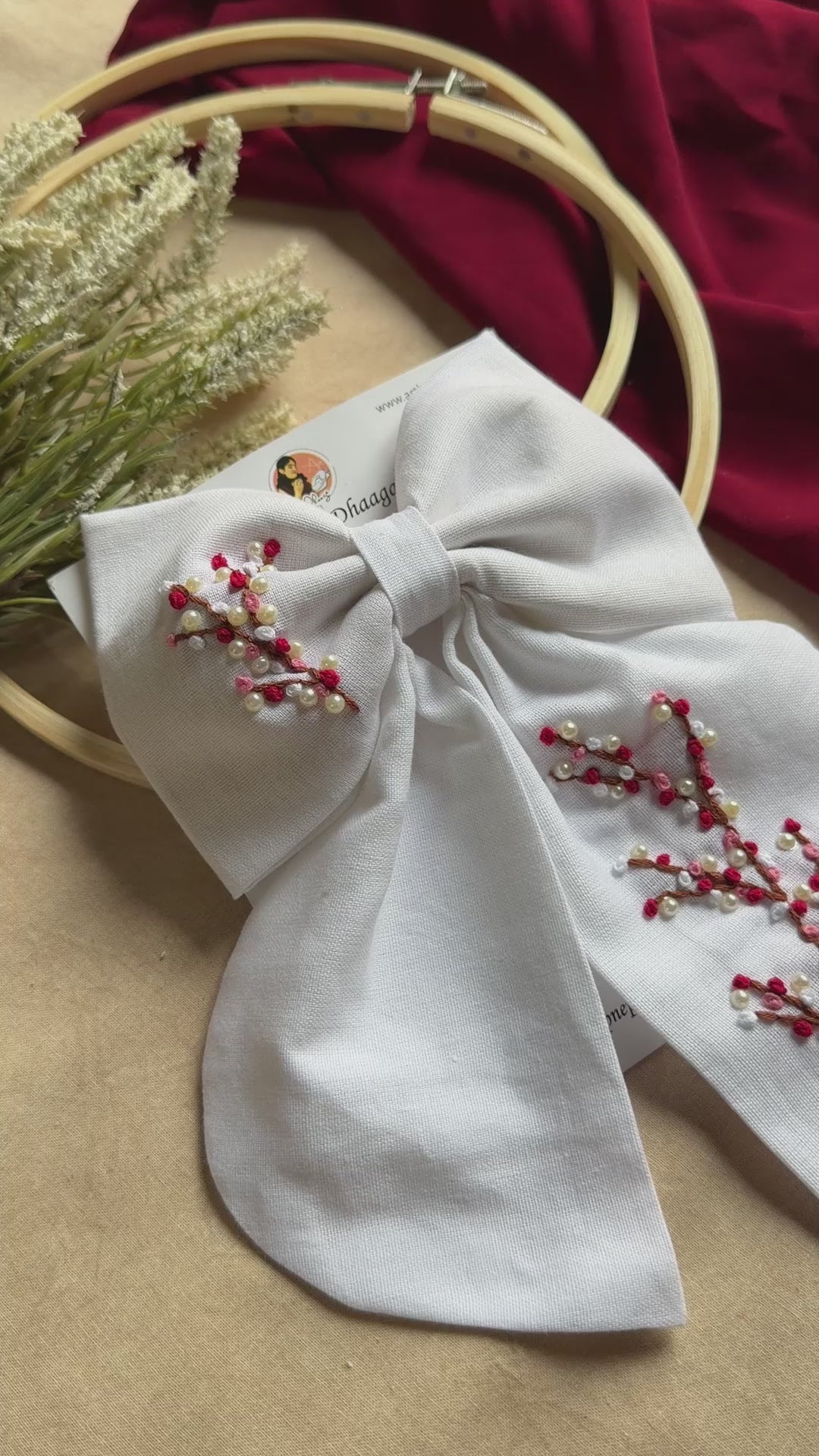 Fine branch embroidery with pearl and red accents.