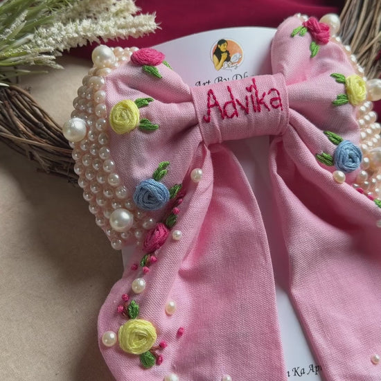 Gulnaar Hand Embroidered Personalized Floral Bow Hair Clip – Pink