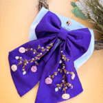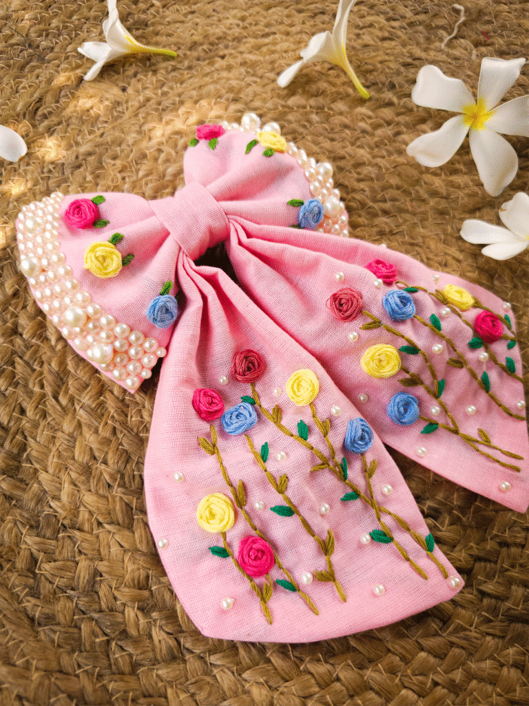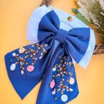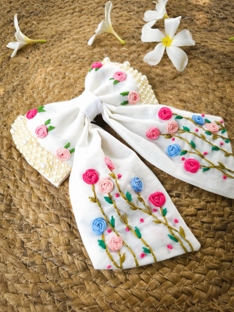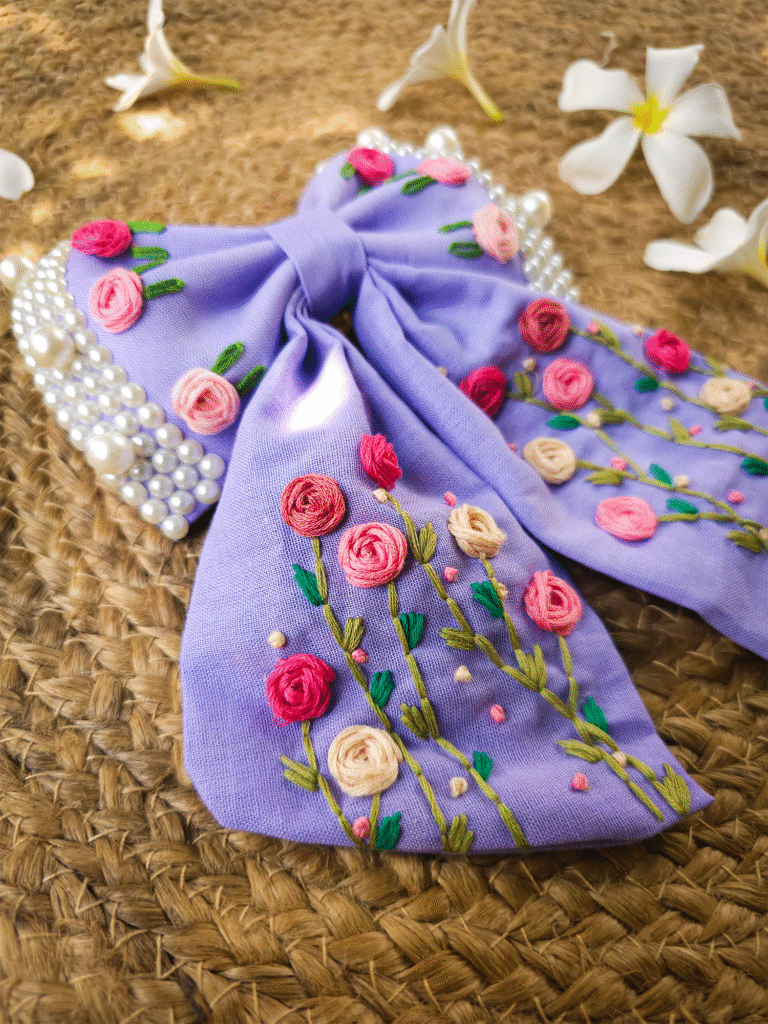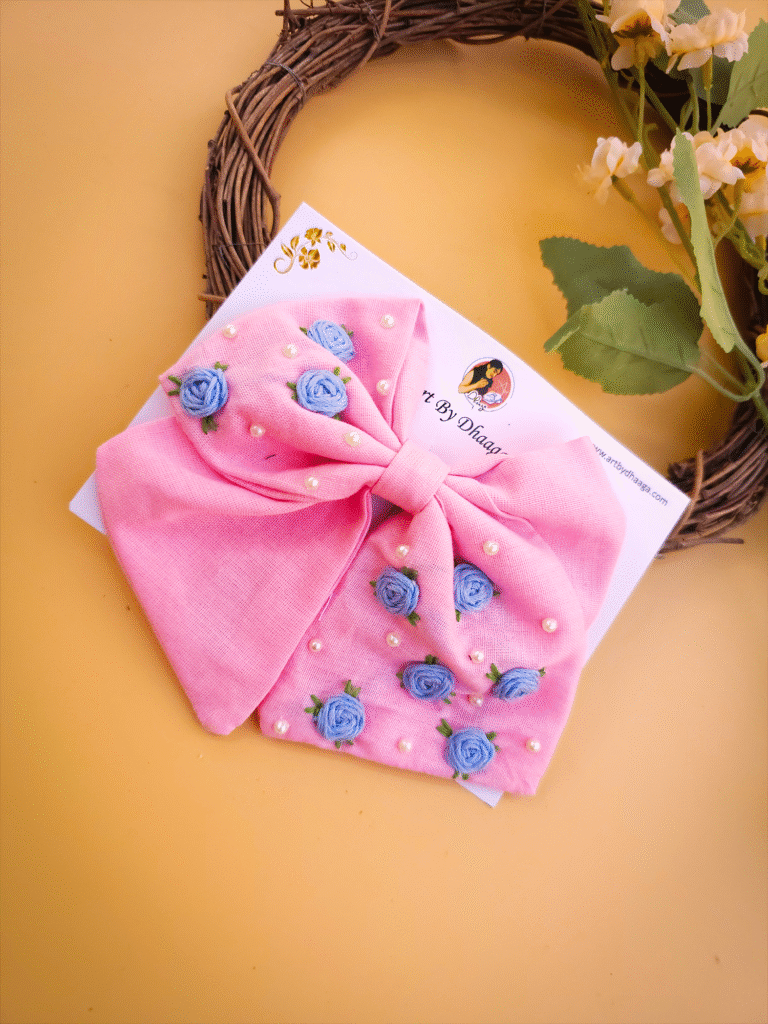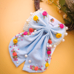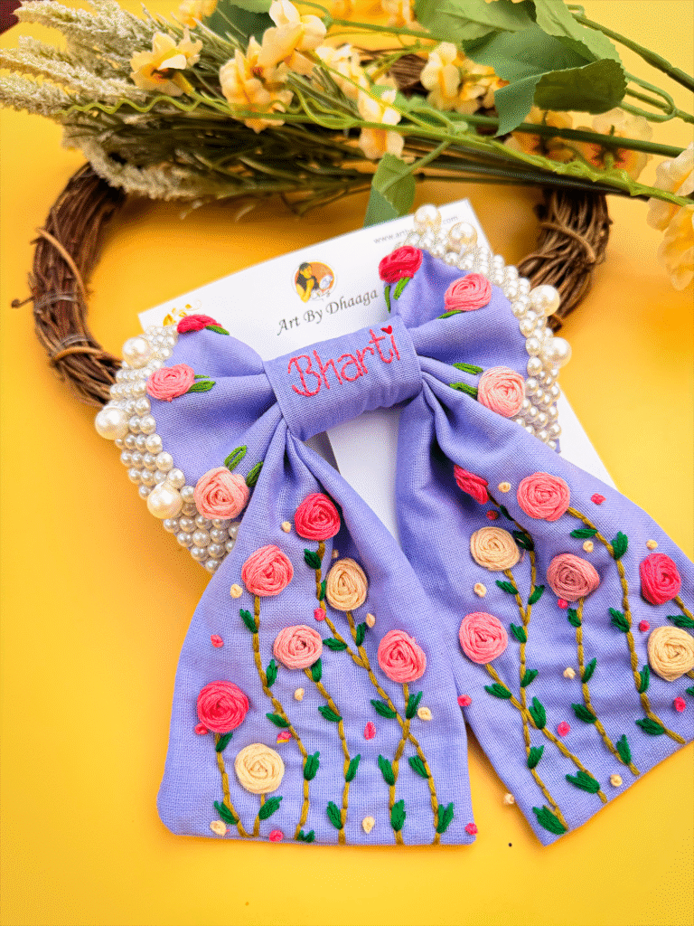 Aaradhya–Denim💙– Hand-Embroidered Floral Tail Bow